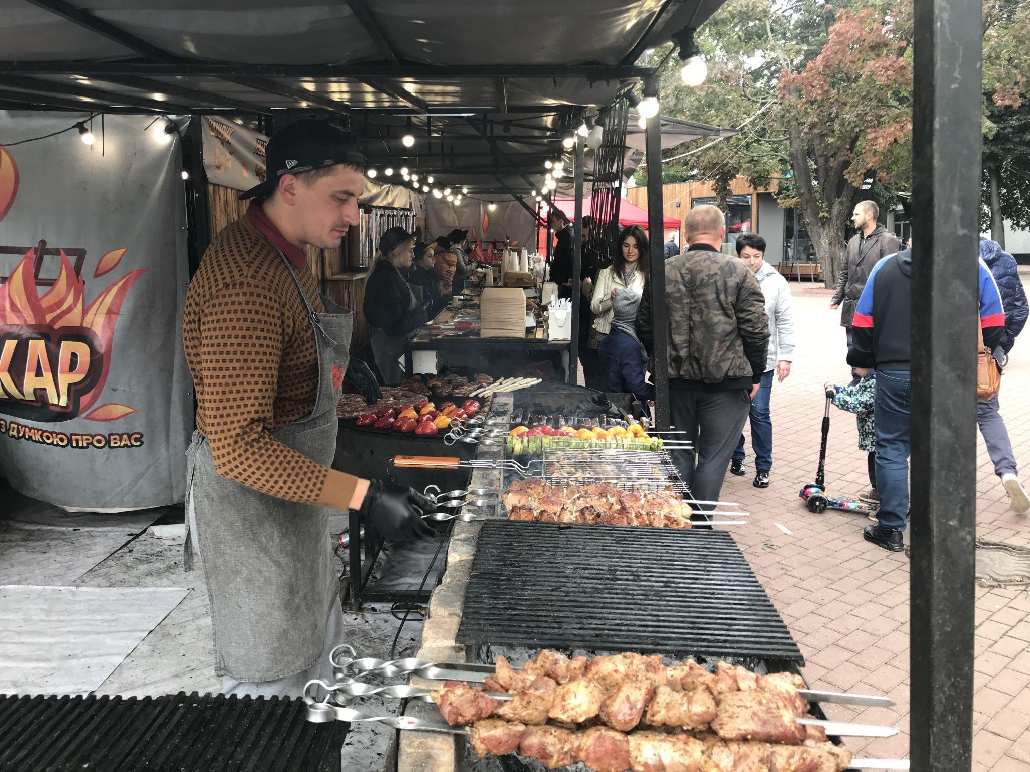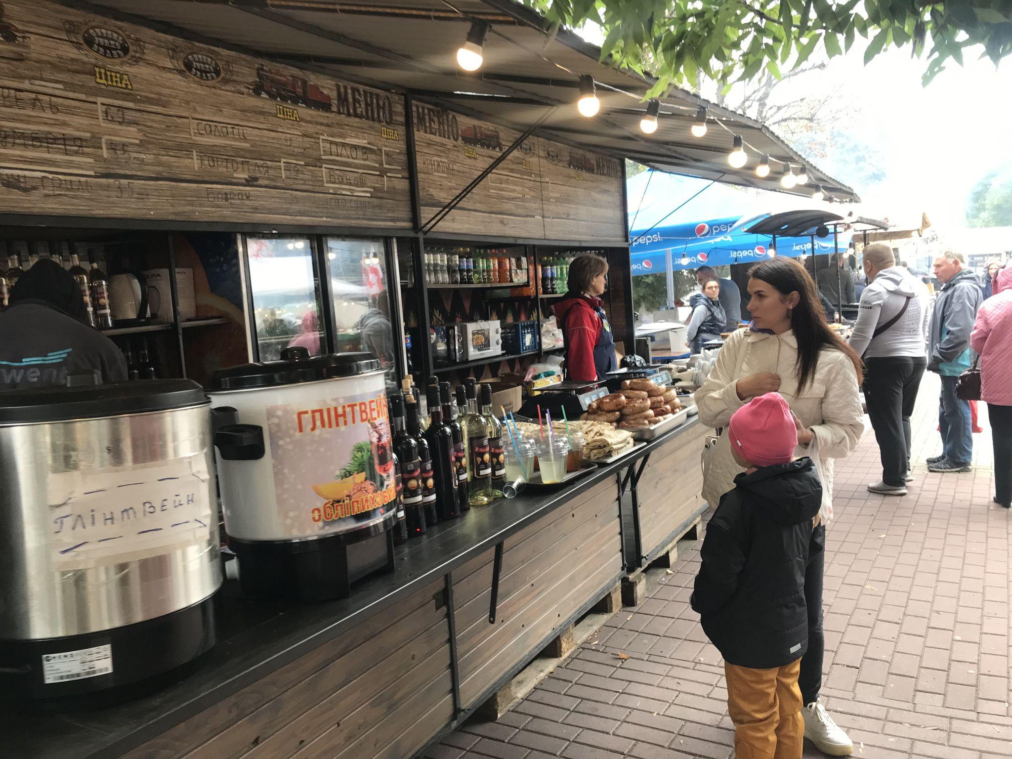 Десятки людей привабив фудкорт, що розміщений поблизу кінотеатру Шевченка. Там варять глінтвейн, смажать м‘ясо, готують плов, овочі на грилі та решту смаколиків. Продавці гостинно запрошують покупців і навіть пропонують скуштувати чи то напій, чи то страву.