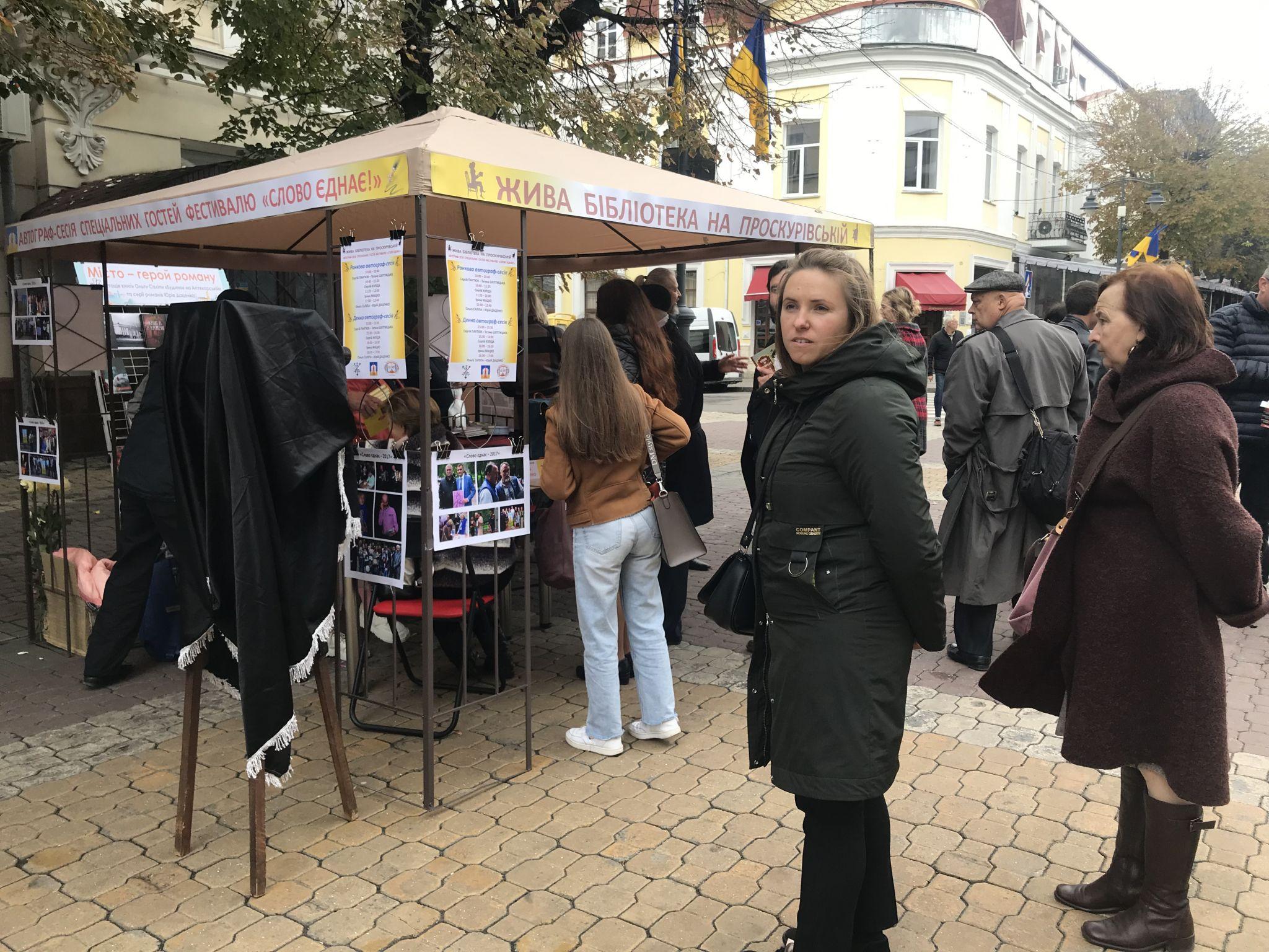 Далі по курсу на Проскурівській - жива бібліотека. Там проходять презентації ретророманів хмельницьких письменнників - Ольги Саліпи та Юрія Даценка. Біля намету містяни утворили чергу, чекаючи на примірник з автографом.