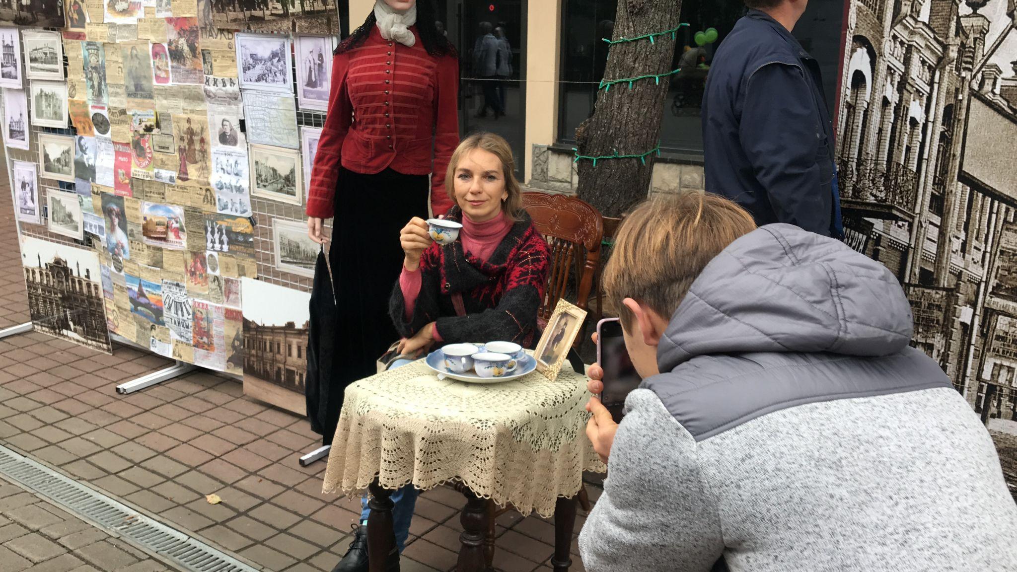 Тут же серед історичних фотографій, розташована фотозона у такому ж ретро-стилі. Хмельничани позують все за тією ж схемою - жінки й діти в об’єктиві, а чоловіки у ролі фотографа.