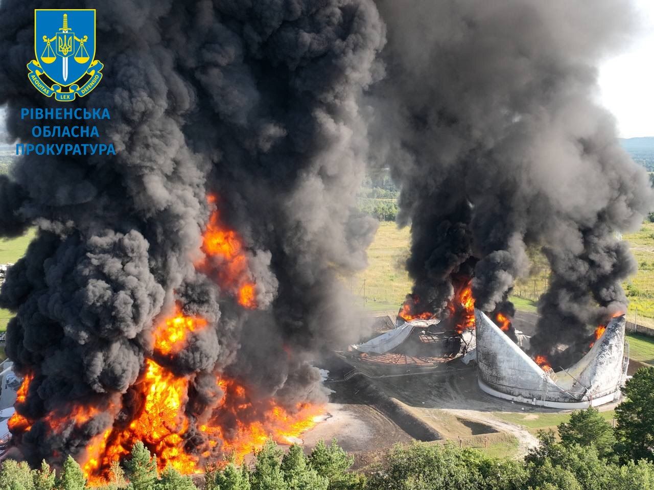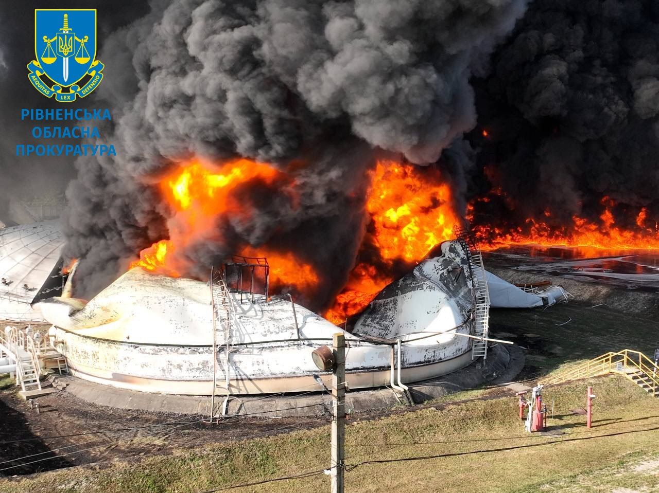 Прокуратура Рівненської області опублікувала фото наслідків удару по нафтобазі. Правоохоронці зазначають, що росіяни завдали удару по території нафтобази безпілотниками "Герань-2". У результаті удару знищено резервуари з пальним нафтобази, виникла пожежа. Жертв - немає.