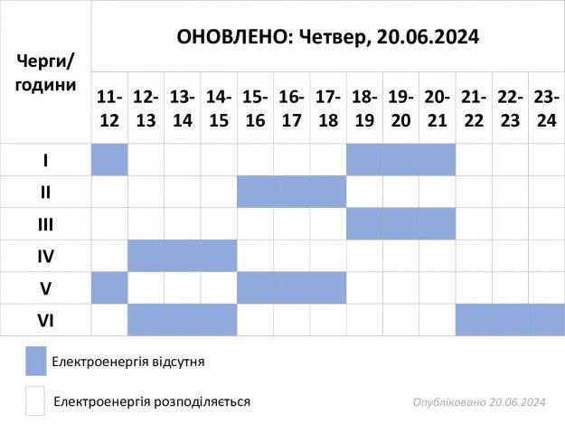 За розпорядженням НЕК «Укренерго», сьогодні, 20 червня 2024 року, з 11:00 до 22:00, відключення відбуватимуться за двома чергами одночасно, повідомляє обленерго