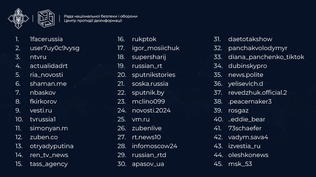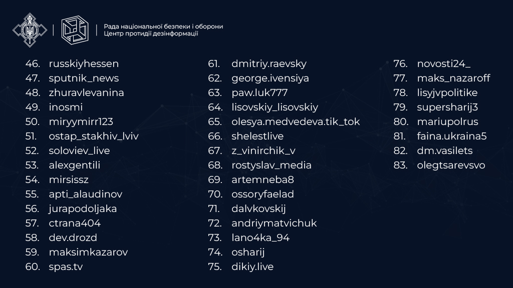 У відомстві підготували список каналів, які займаються поширенням ворожої пропаганди. Наразі таких є 83 акаунти. Сюди належать канали російських пропагандистів, як володимира соловйова, маргарити симоньян тощо, кремлівських ЗМІ ТАСС, вести, РЕН ТВ тощо. До списку потрапив російський артист Shaman і блогер анатолій шарій.
