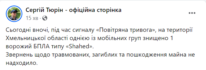 В Хмельницькій ОВА додали, що внаслідок атаки ніхто не постраждав.