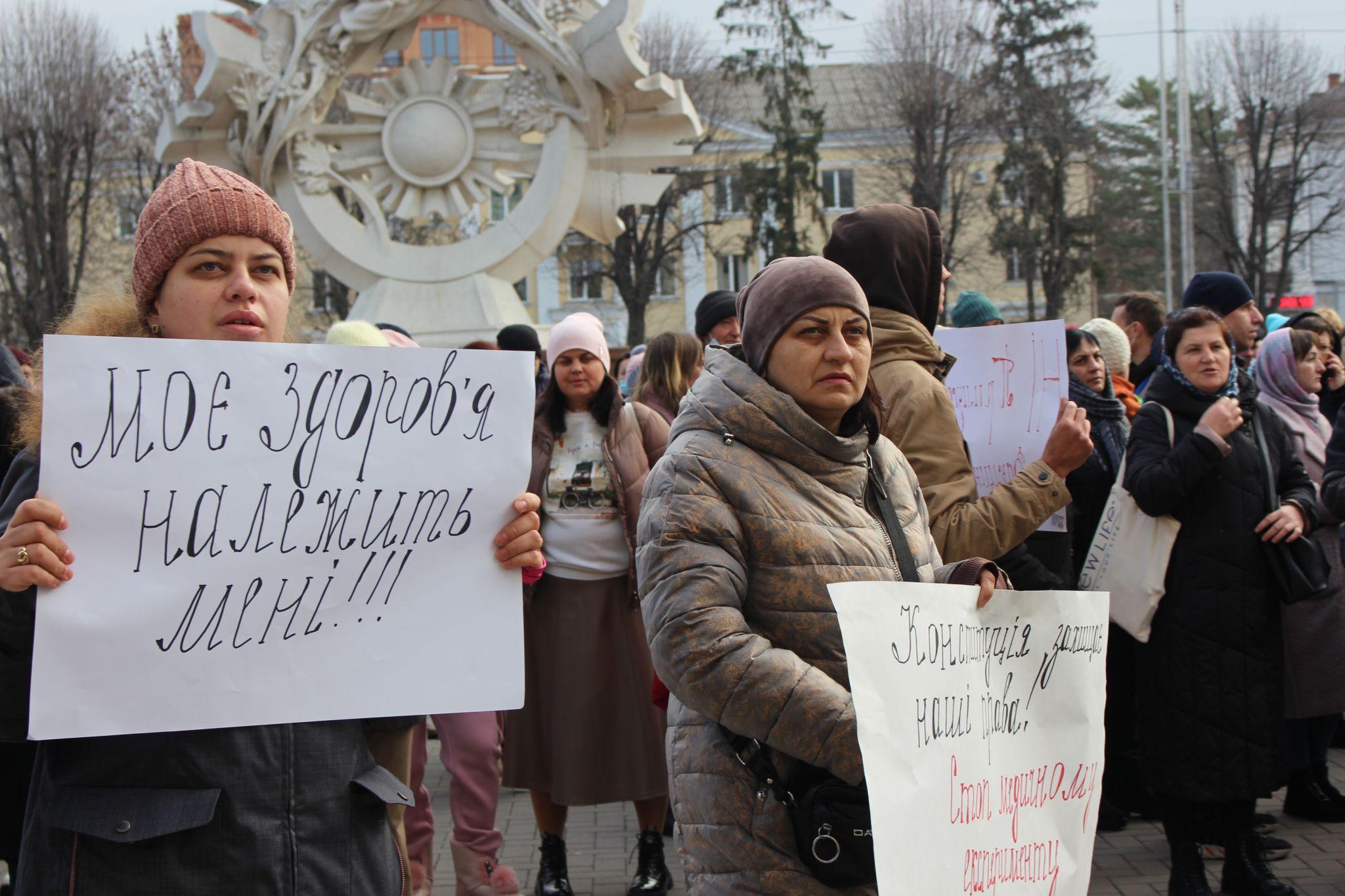 Близько 09:00 учасники мітингу зібралися на алеї навпроти Будинку рад, тримаючи в руках плакати з написами “Моє здоров'я належить мені”, “Ні примусовій вакцинації”, “Конституція захищає наші права”.