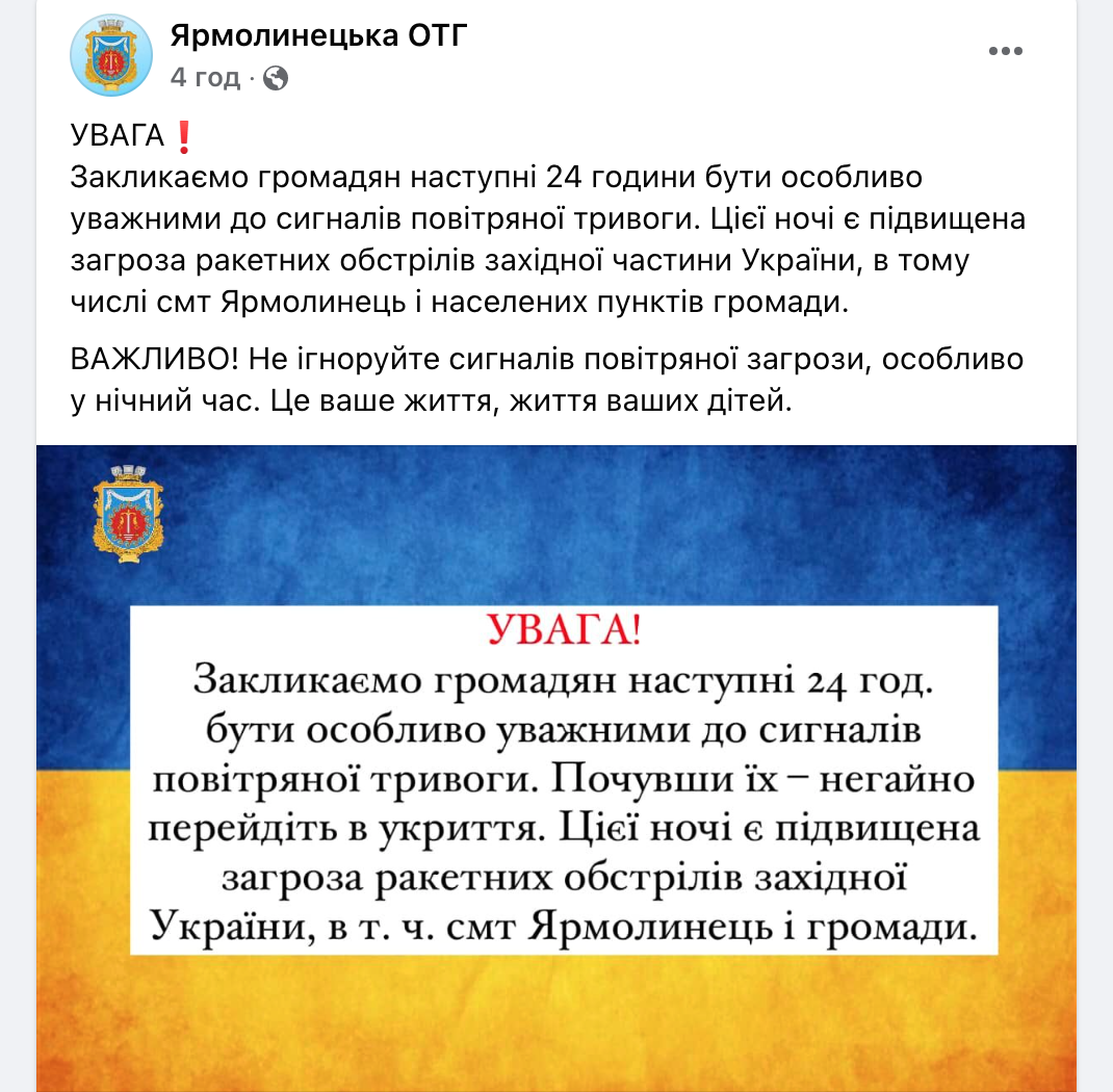 Ще до початку повітряної тривоги на сторінці Ярмолинецької ОТГ у Facebook опублікували попередження для мешканців громади.
