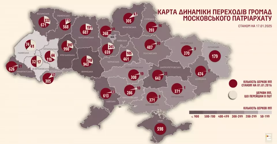 Також по 29 громад втратила УПЦ МП у Київській і Черкаській областях. А 25 парафій перейшло на Вінниччині. Ще у чотирьох регіонах, у Донецькій, Запорізькій, Івано-Франківській та Миколаївській області, у 2024 році не було зафіксовано жодного переходу. По одній громаді московський патріархат втратив на Харківщині, Тернопільщині, Закарпатті та в Києві.