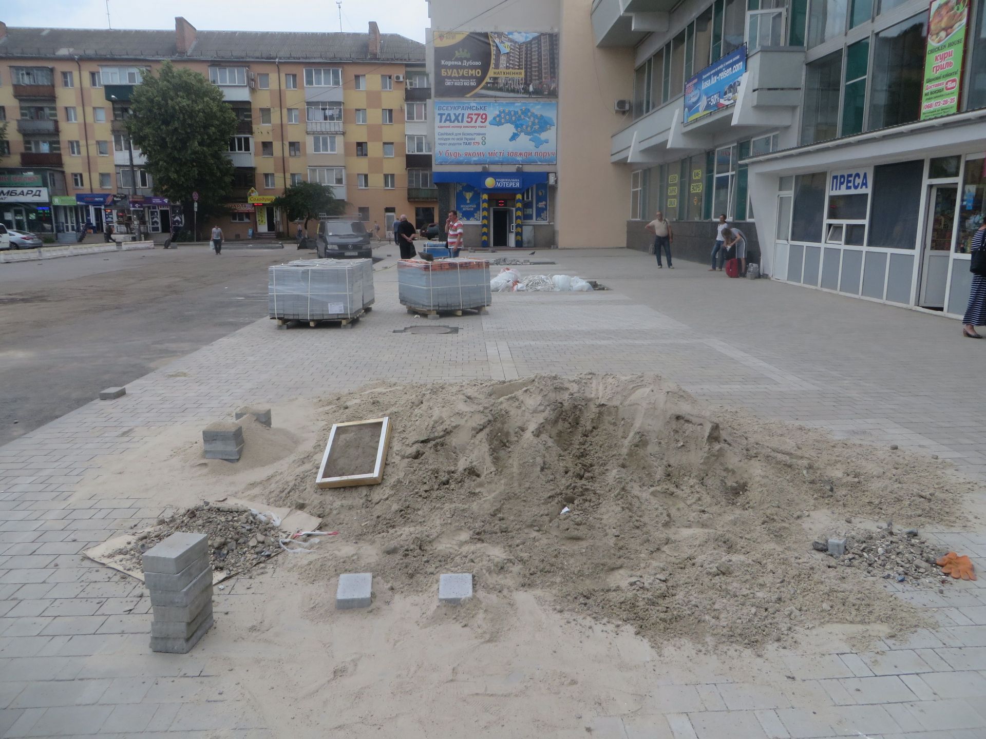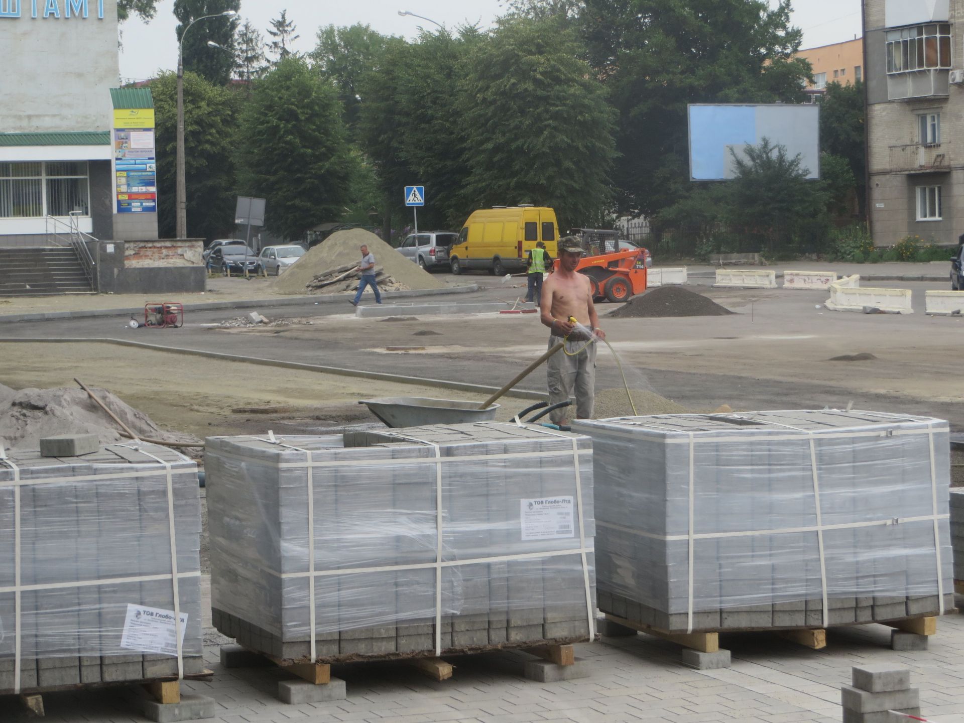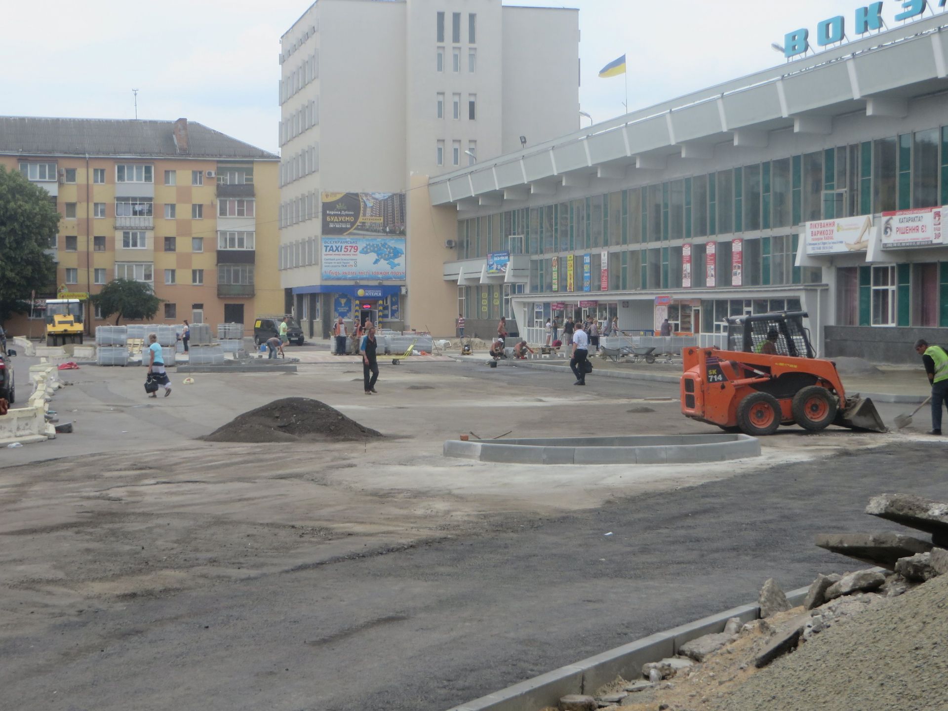 За ремонт працівники «Будмаксплюс» взялися наприкінці квітня. Тоді почали зривати старий асфальт і плитку. Також на частині ділянки, де буде нове покриття, готували основу. Тепер же поки одні працівники кладуть бруківку, інші заливають асфальтом заїзд до вокзалу. Завершити роботи планують до кінця літа.