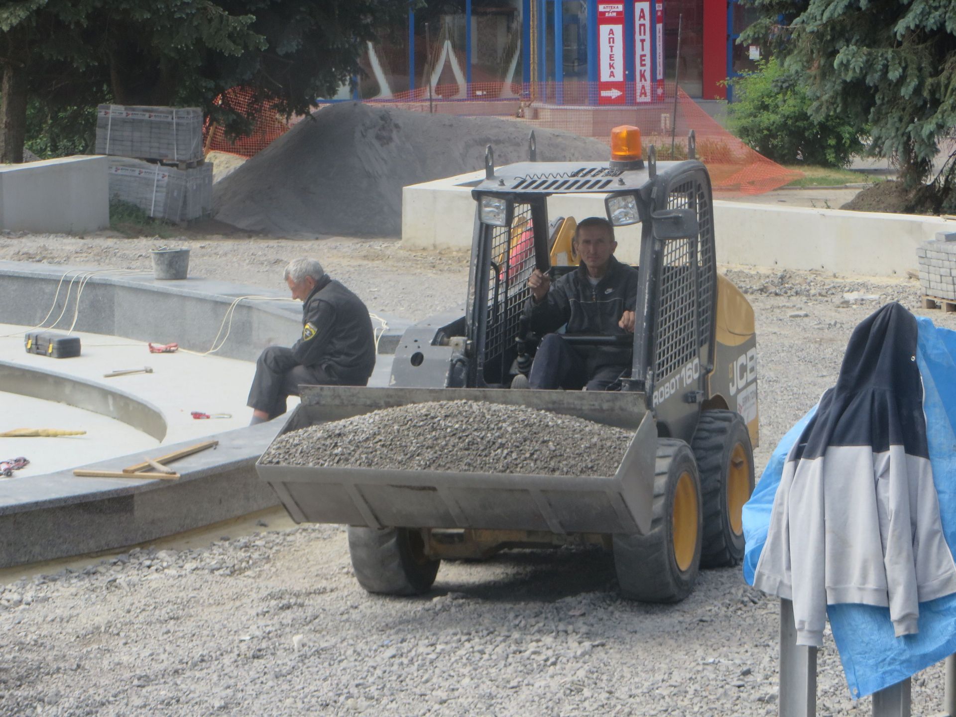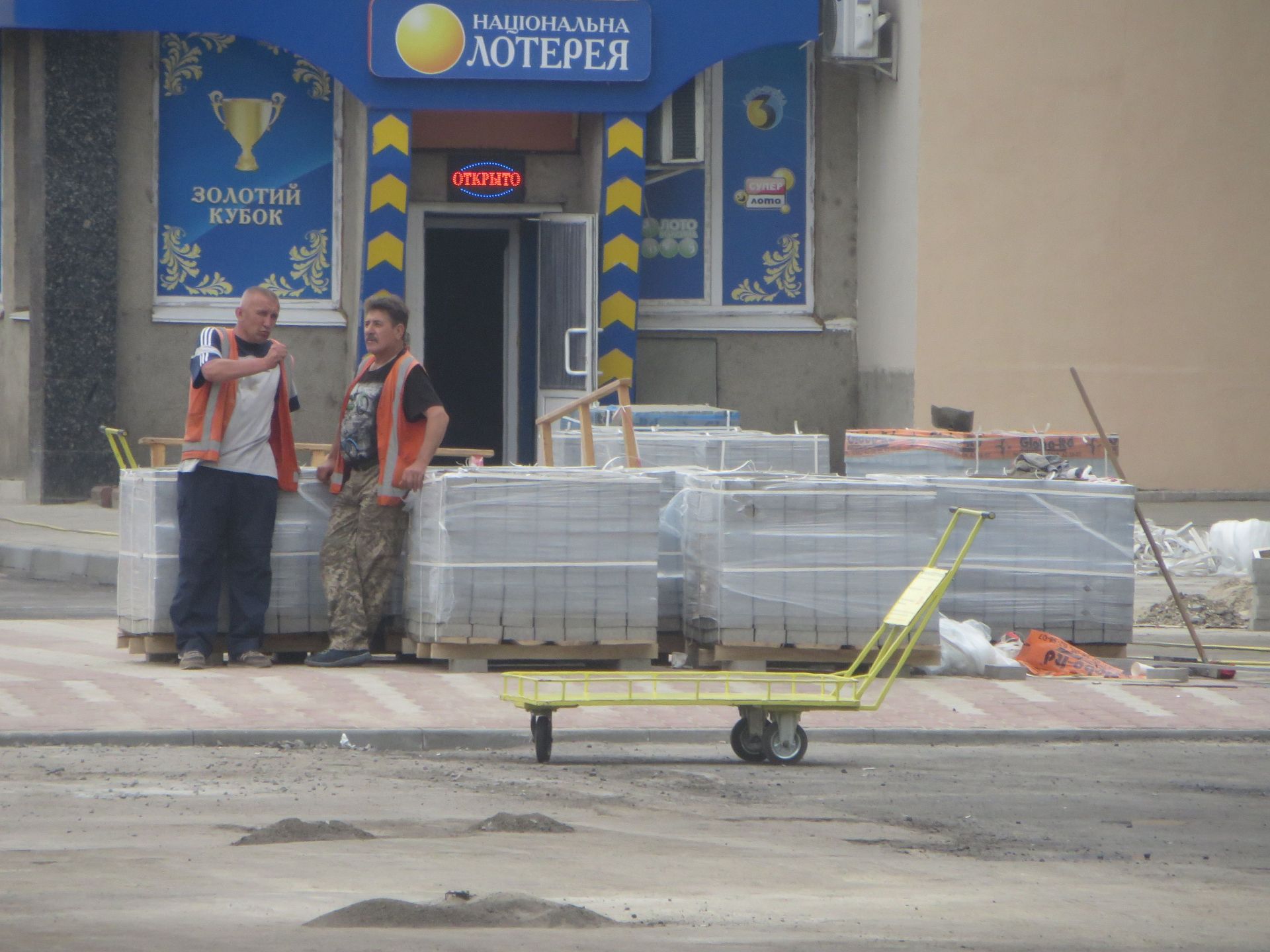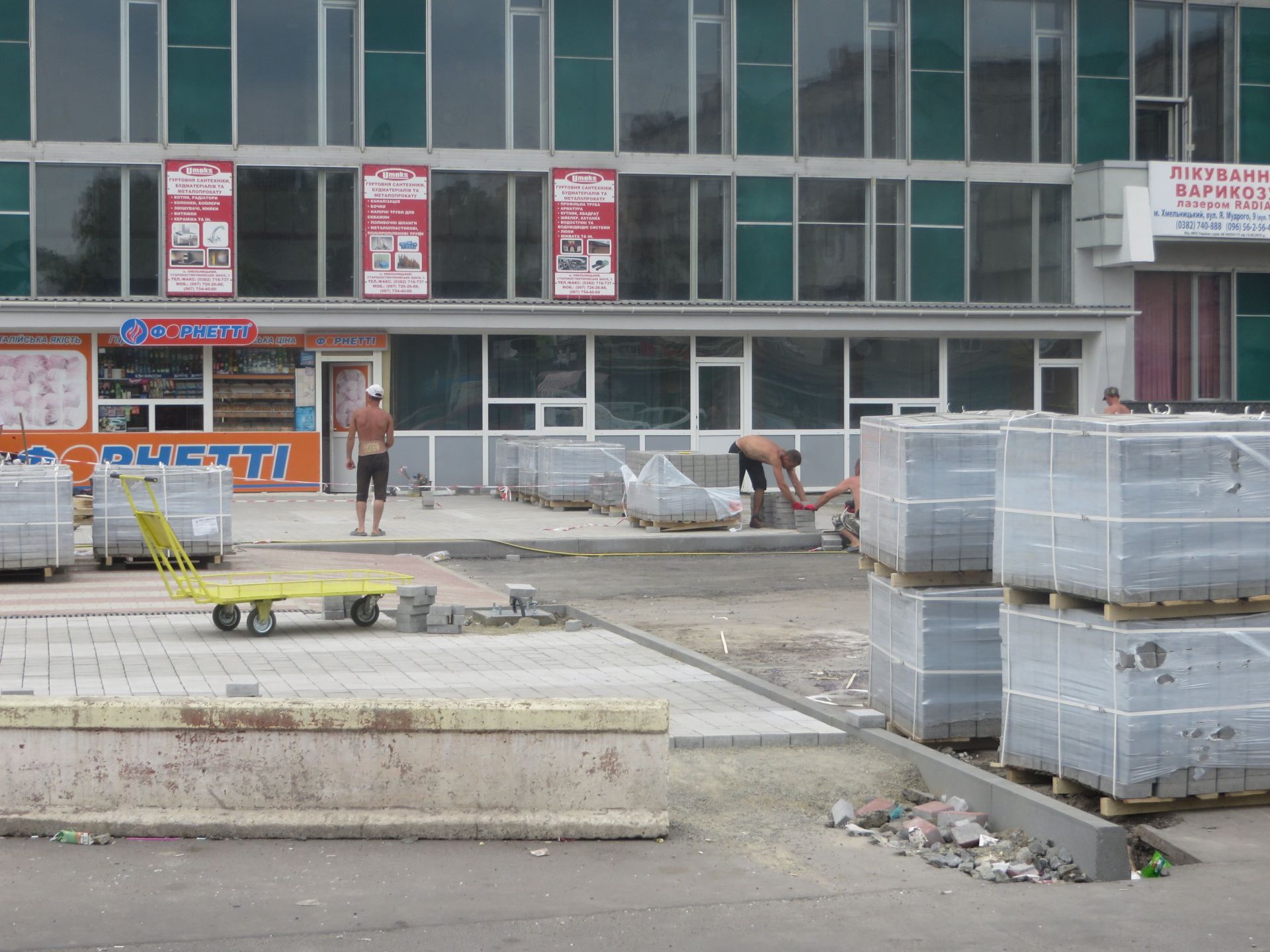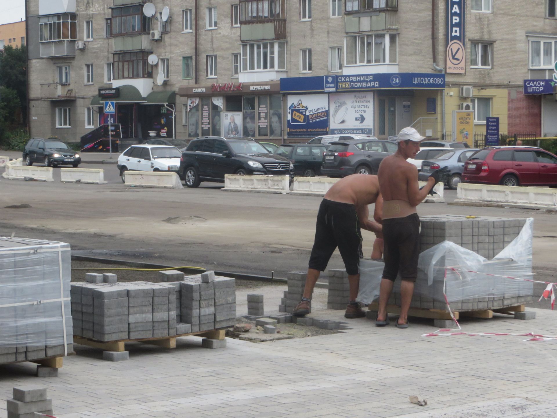 За ремонт працівники «Будмаксплюс» взялися наприкінці квітня. Тоді почали зривати старий асфальт і плитку. Також на частині ділянки, де буде нове покриття, готували основу. Тепер же поки одні працівники кладуть бруківку, інші заливають асфальтом заїзд до вокзалу. Завершити роботи планують до кінця літа.