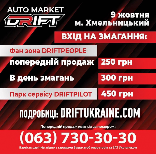 Попередній продаж квитків «ФАН ЗОНА DRIFTPEOPLE» - 250 гривень, у день змагань - 300 гривень.