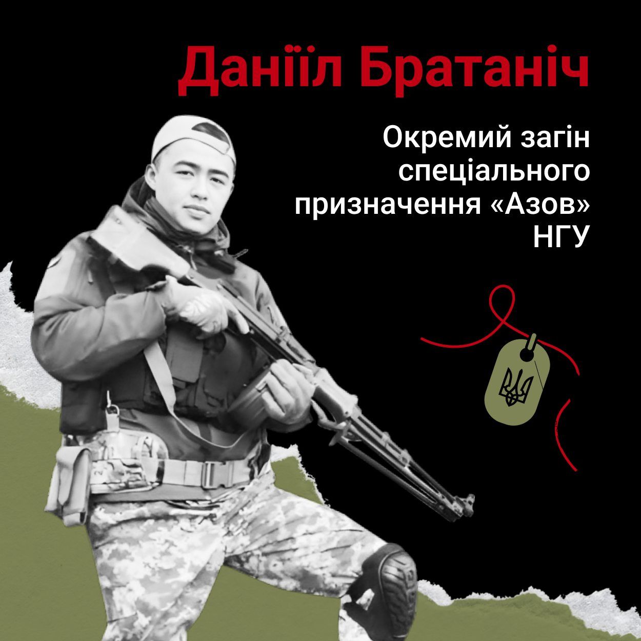 — Прошу присвоїти звання Героя України посмертно моєму сину Братаніч Даніїлу Віталійовичу. На початку війни пішов добровольцем до війська. Служив в полку 'АЗОВ'. 20 вересня 2022 року загинув при виконанні завдання на Донецькому напрямку, Волноваський район. Синові було лише 23… Назавжди в строю!!! Прошу присвоїти посмертно звання Героя України, — зазначила в зверненні Наталія Братаніч.