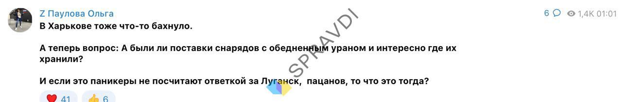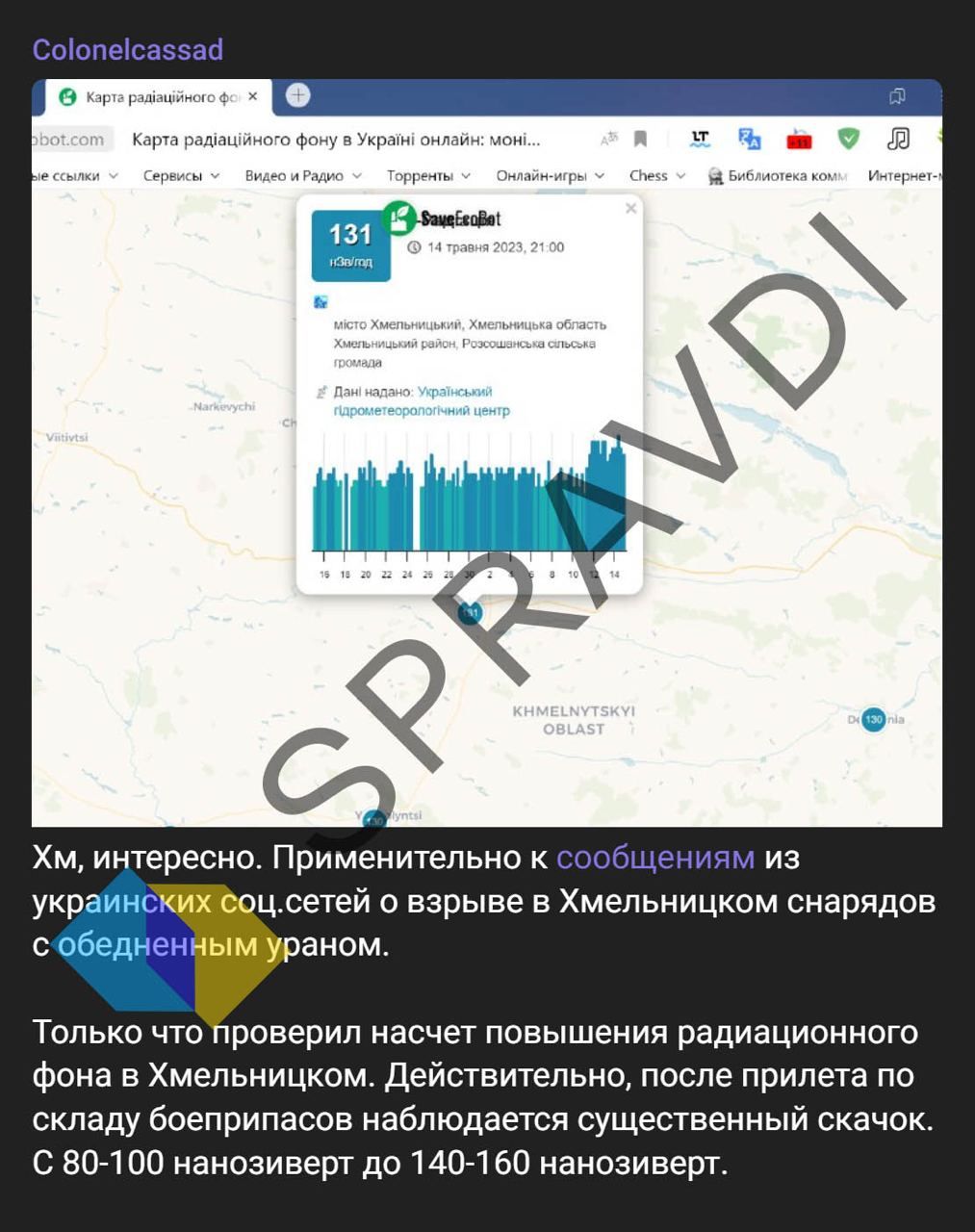 Натомість ще з суботньої ночі фейкороби рф почали масований розгін дезінформації і паніки. росіяни пишуть, що на Хмельниччині зріс радіаційний фон через детонацію боєприпасів зі збідненим ураном. Про це повідомляє Центр стратегічних комунікацій та інформаційної безпеки.