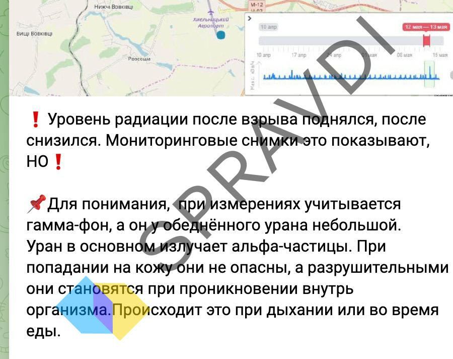 Вже ввечері 14 травня пропагандисти підключили до розгону телеграм-канал російського «експерта» рожина, який має 833 тисячі підписників. Він написав, що «після прильоту по складу боєприпасів спостерігається суттєвий стрибок рівня радіації».