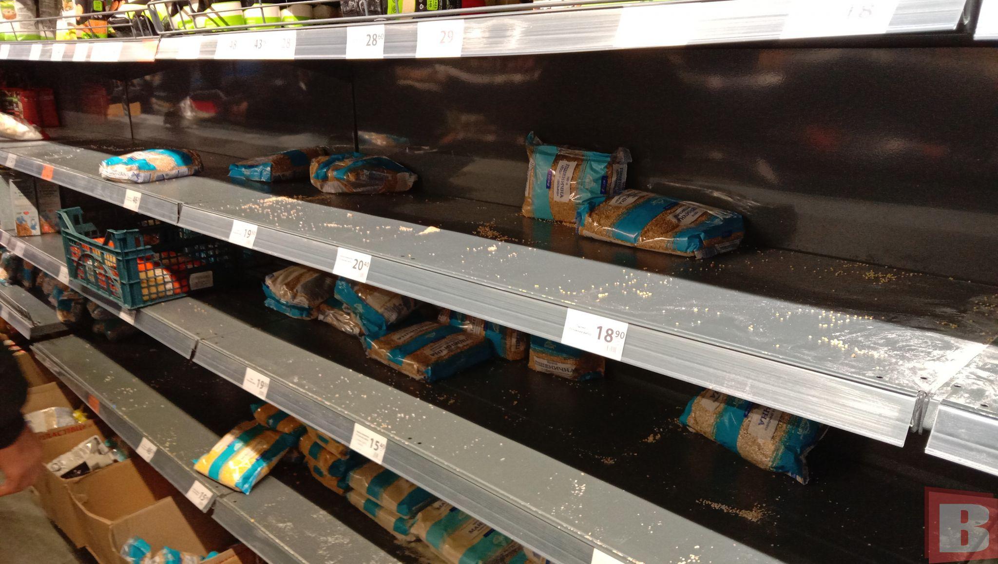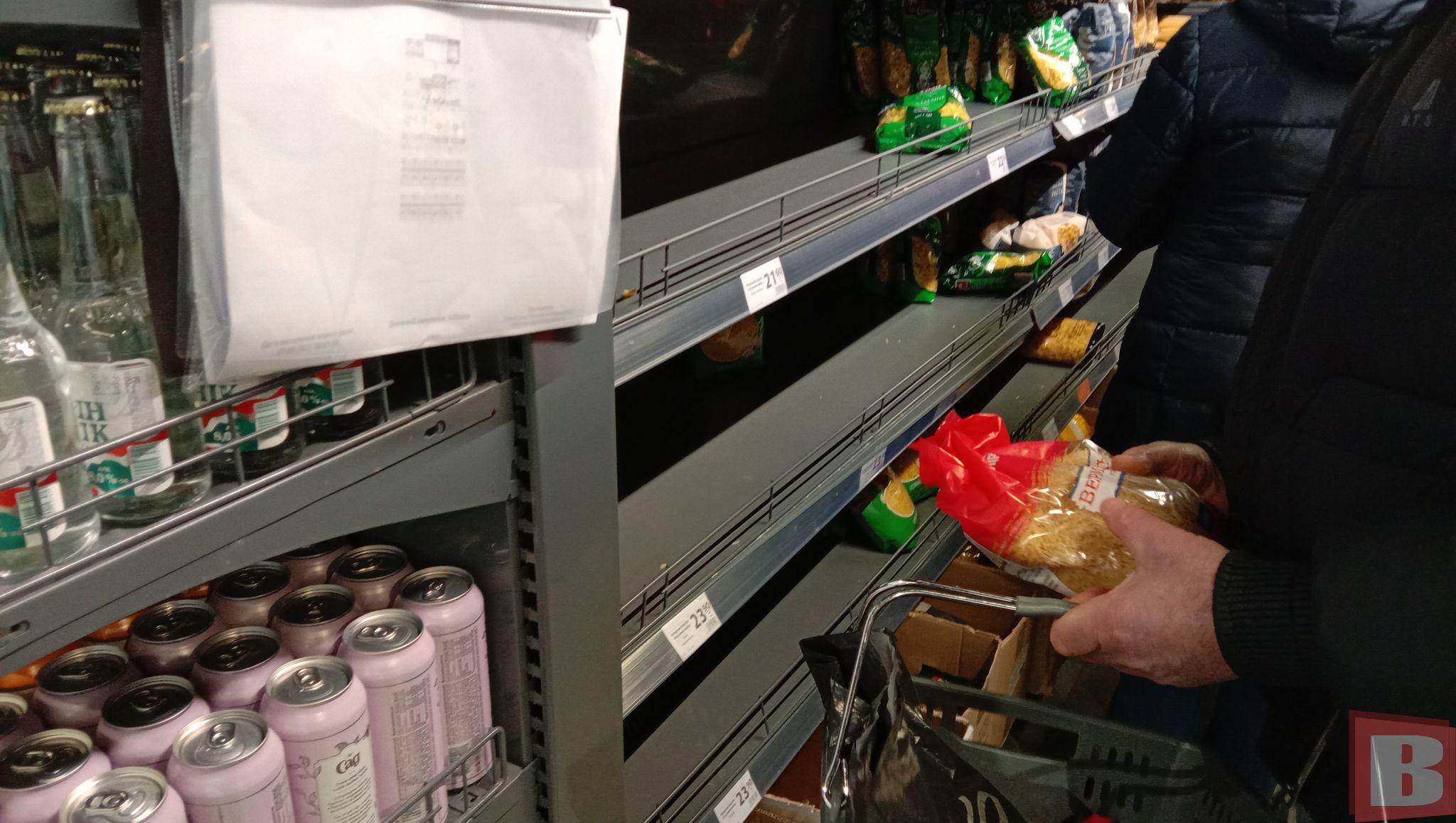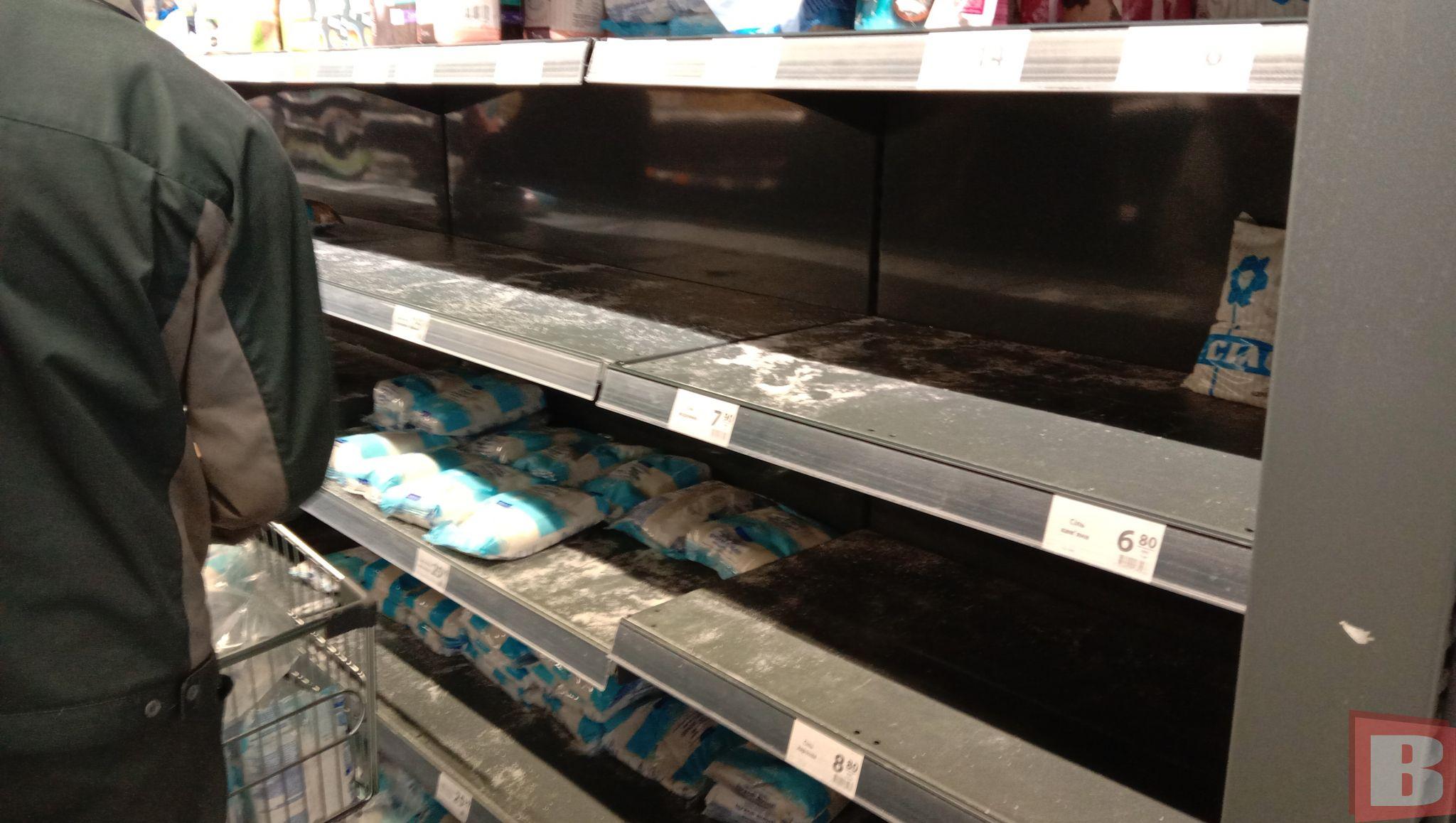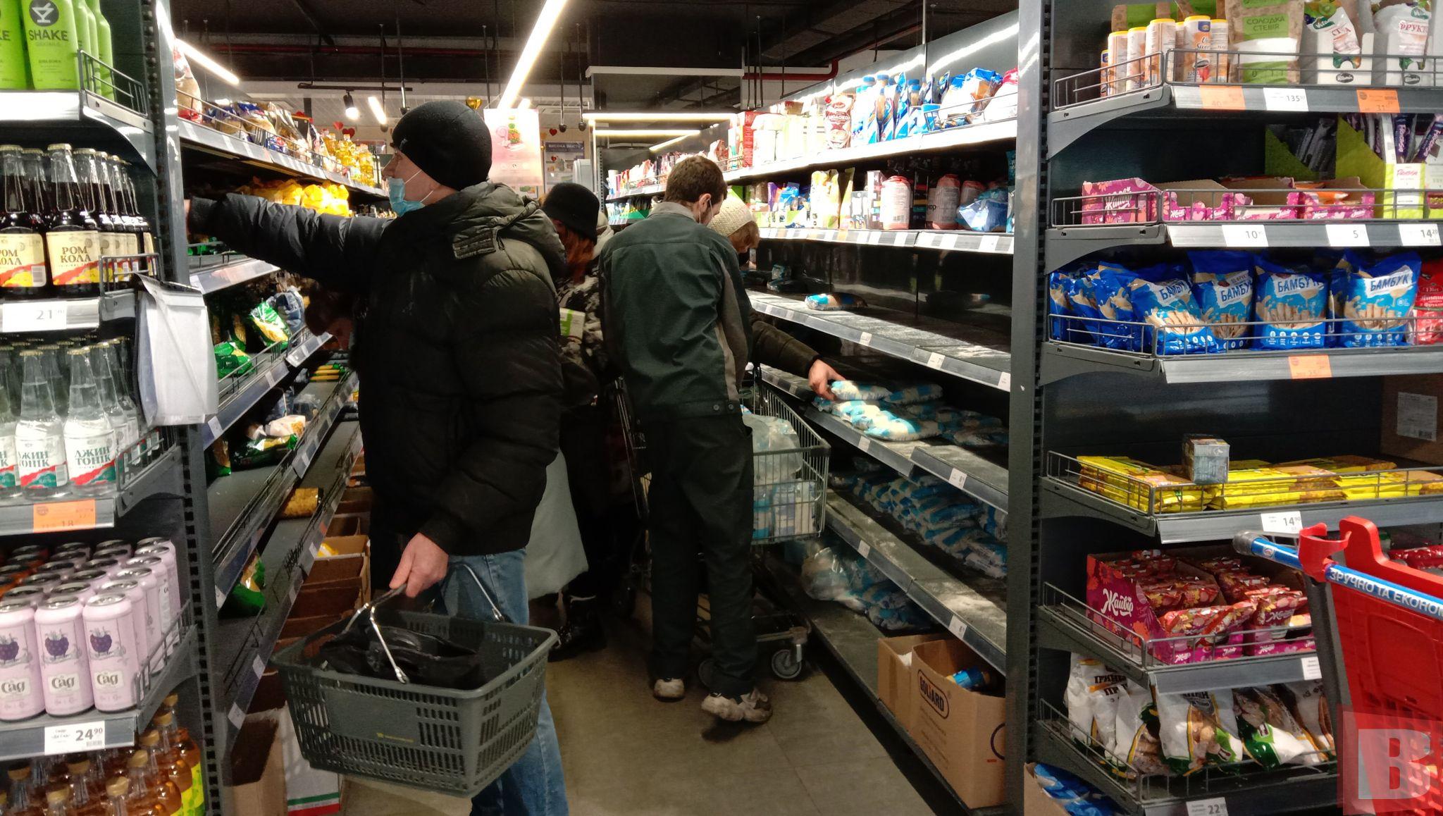 Журналіст vsim.ua пройшовся вулицями міста, аби подивитися, що на них відбувається. Отож, найбільше привертають увагу черги до банкоматів, які помітні у різних частинах міста. Крім того, містяни масово скуповують продукти, перш за все крупи. Приклад — супермаркет «АТБ» на проспекті Миру. Додалося роботи працівникам супермаркетів, які додають на полиці продукти.