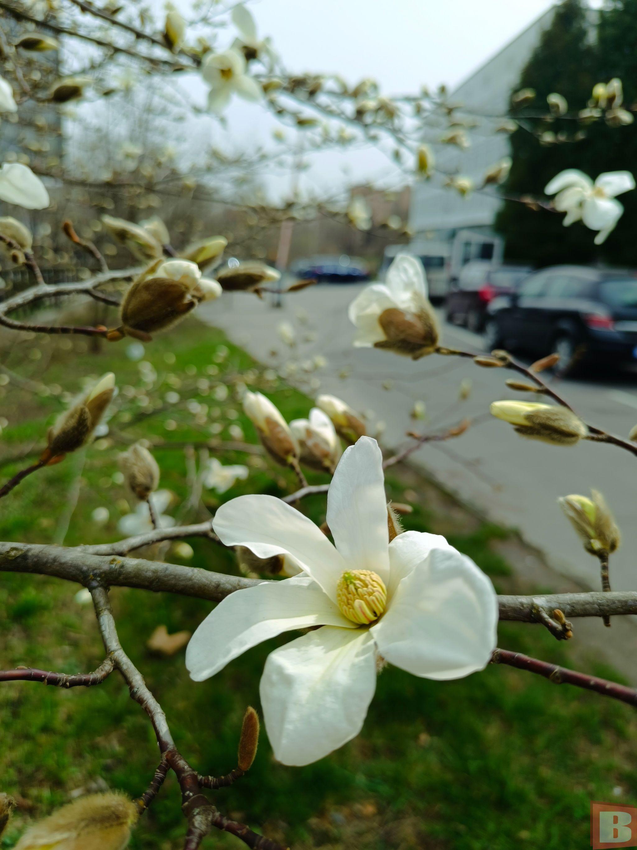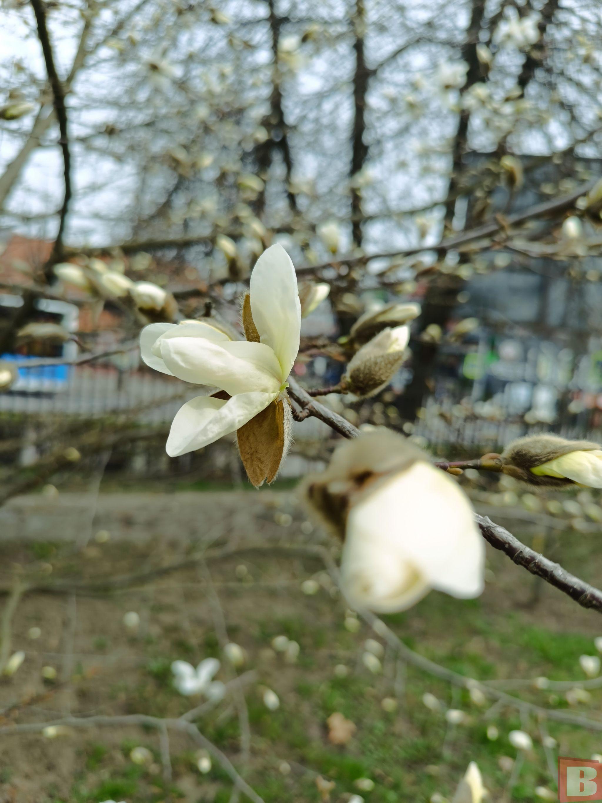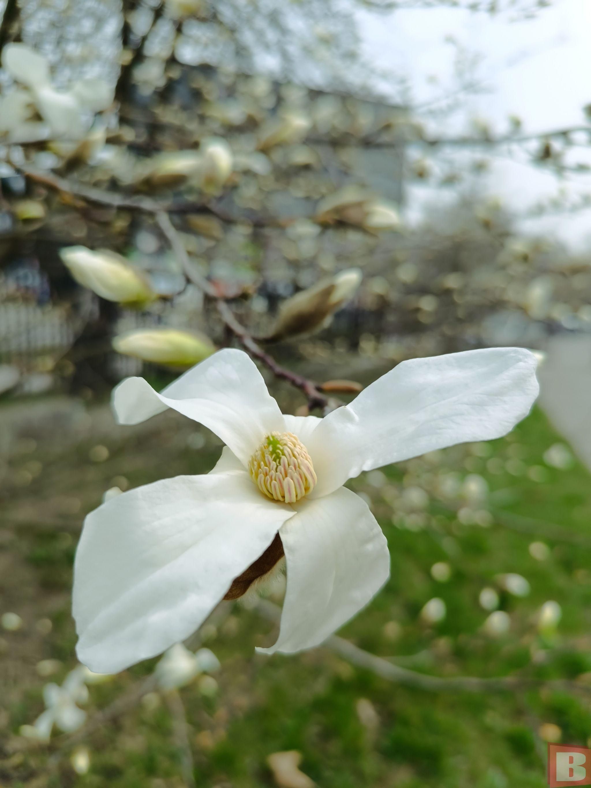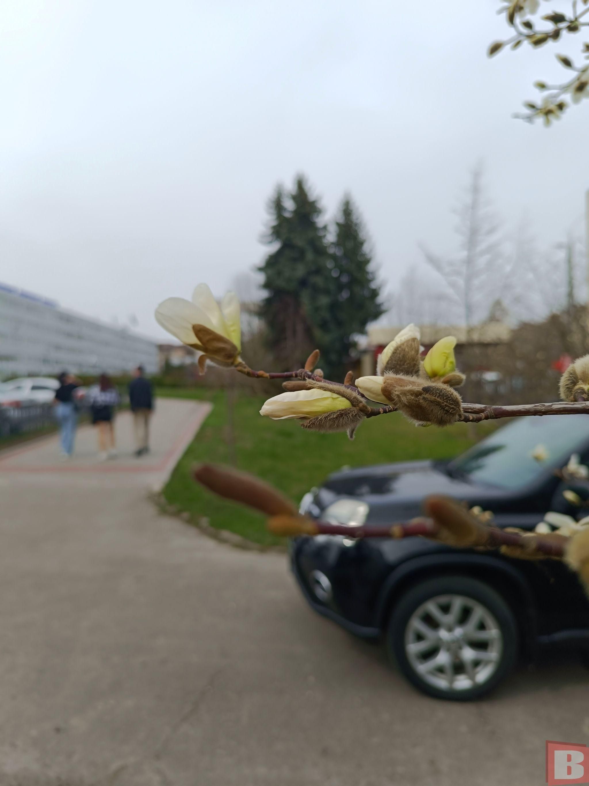 Привертає погляд і біла магнолія, яка вже почала цвітіння. Біля дерева роблять селфі перехожі та знімають відео студентки.