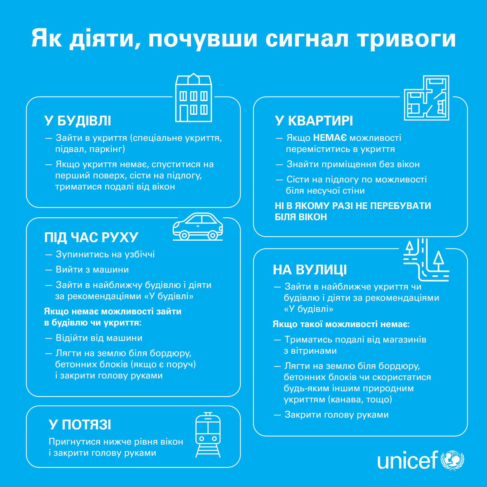 - повідомити їм про сигнал тривоги, заходи безпеки та найближчі укриття.