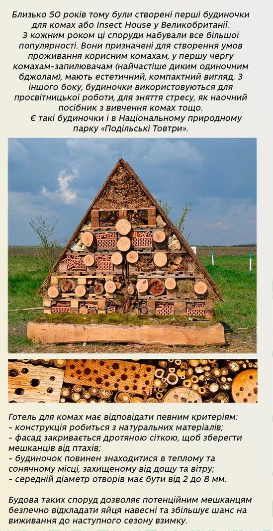 Нещодавно готель для комах з’явився на Кам’янеччині. Його збудували на рекреаційній ділянці "Давня Бакота". Трудилася над комашиним будиночком команда Національного природного парку "Подільські Товтри". Про це розповідають на сторінці парку.