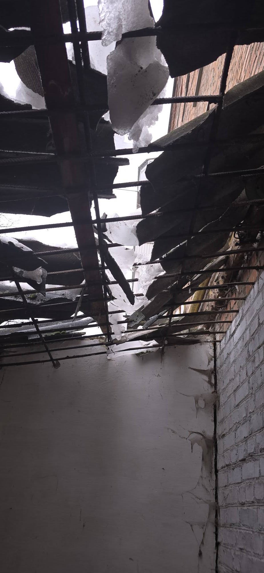 Велика крига зсунулась з даху і впала на будівлю громадської організації. Сталося це вчора, 12 лютого. Як розповідає vsim.ua волонтерка Алла Учик, лід проломив дах прибудови. І пошкодив все майно.