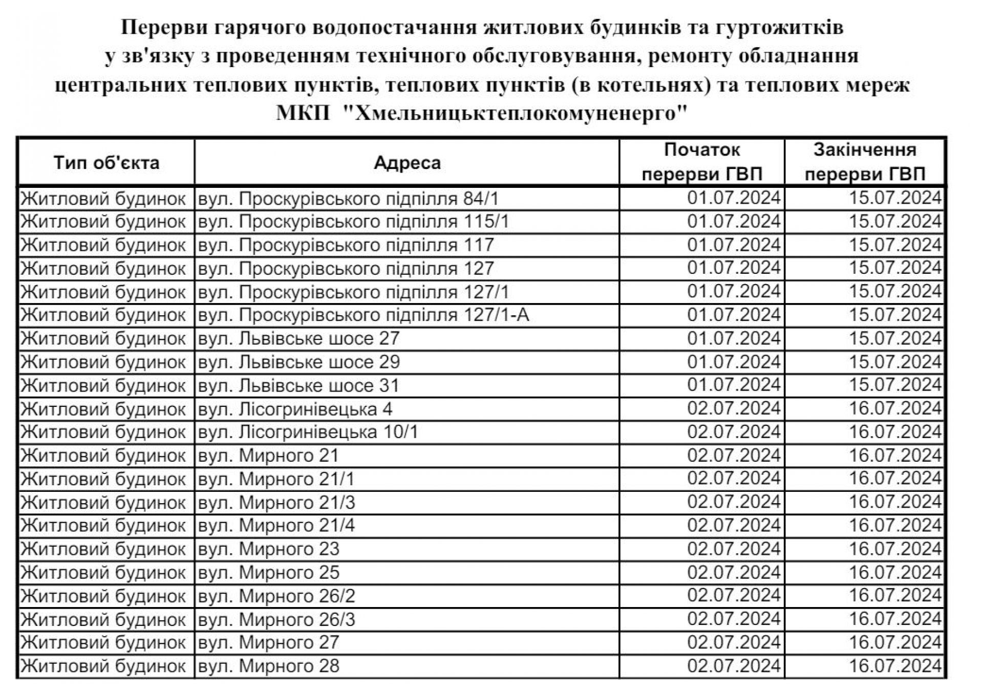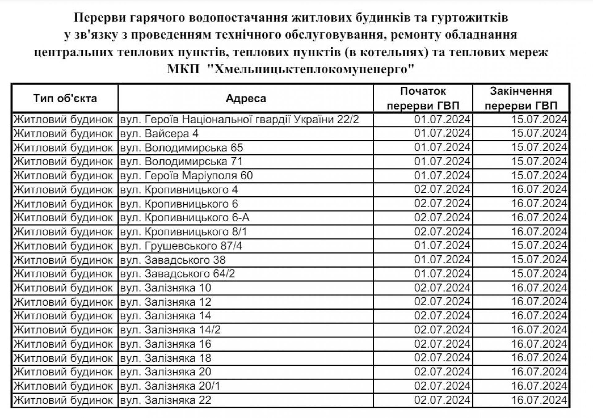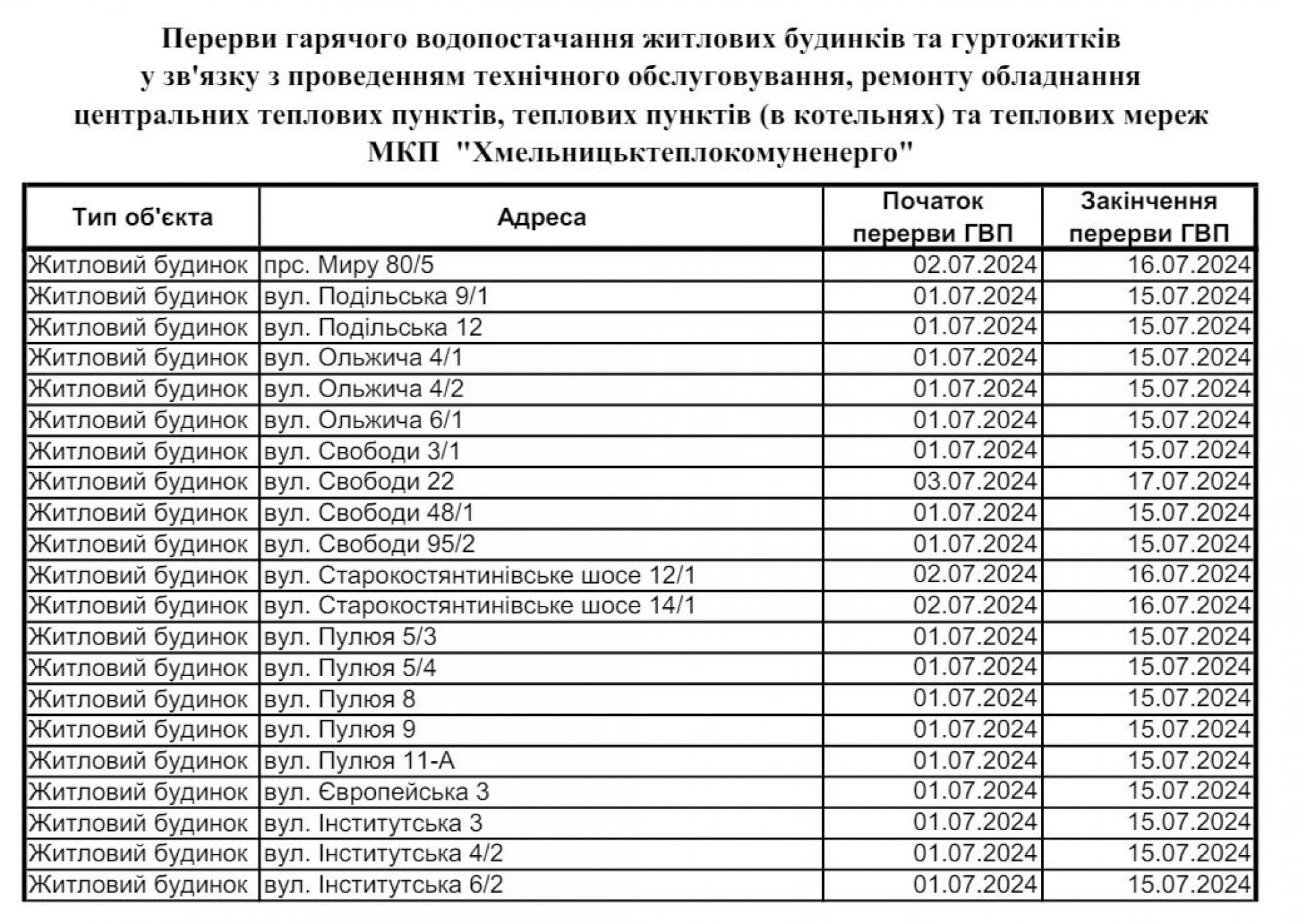 Графік перерв водопостачання у житлових будинках і гуртожитках Хмельницького подали у МКП «Хмельницьктеплокомуненерго». Відповідно до нього, вимикатимуть гарячу воду на два тижні починаючи з 1 та 2 липня.