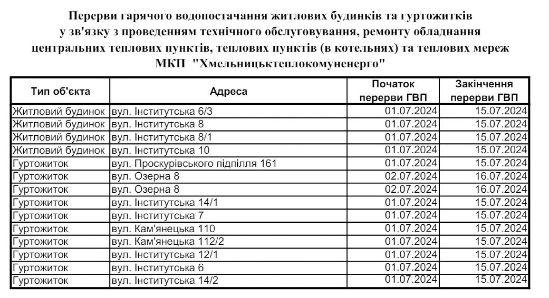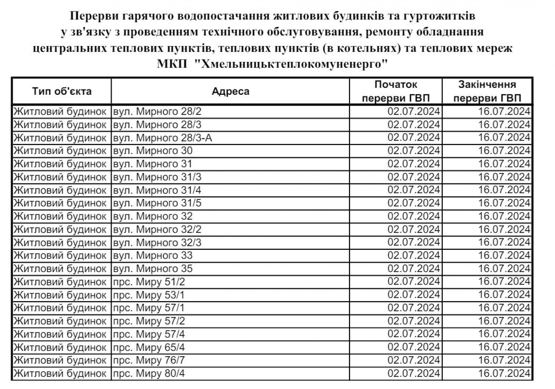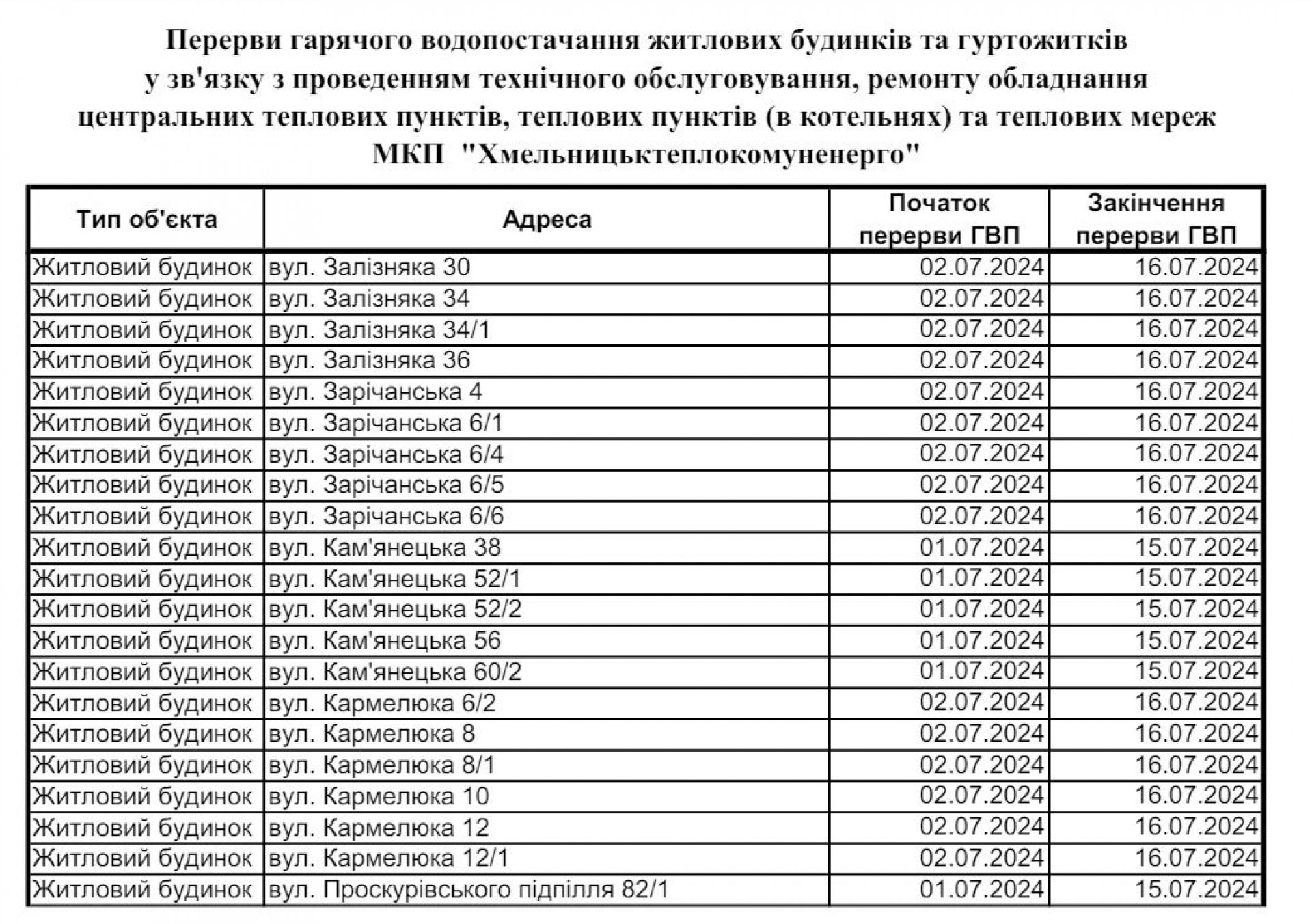 Графік перерв водопостачання у житлових будинках і гуртожитках Хмельницького подали у МКП «Хмельницьктеплокомуненерго». Відповідно до нього, вимикатимуть гарячу воду на два тижні починаючи з 1 та 2 липня.