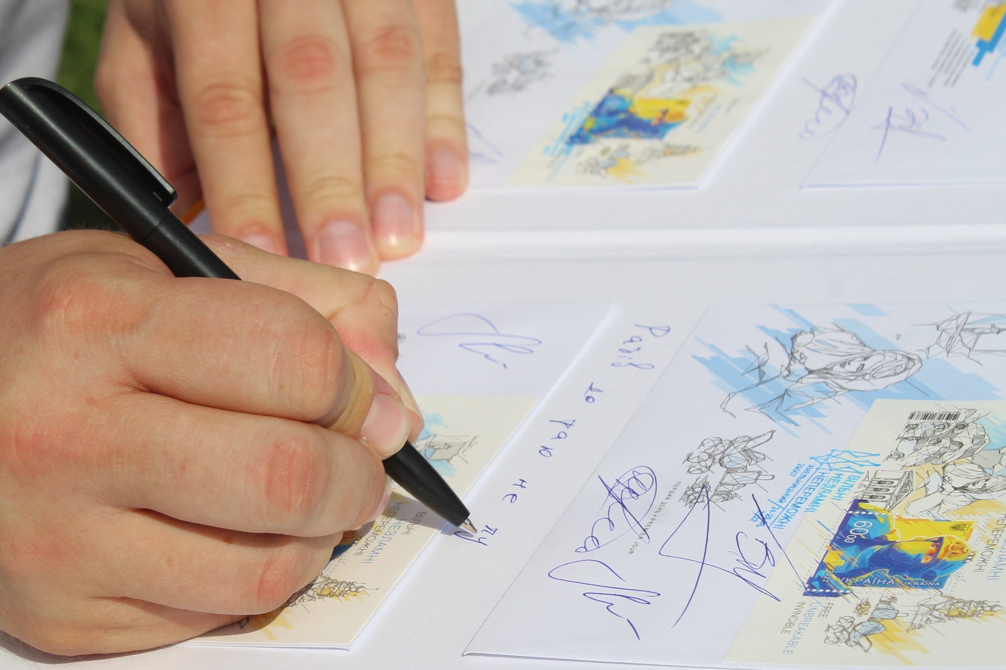 У Хмельницькому ж процедура спецпогашення марки “Вільні, Незламні, Непереможні” відбулася на Майдані Незалежності, біля фотогалереї пам’яті Героїв, які віддали життя за Україну. До церемонії долучилися: