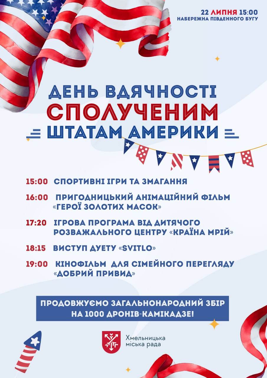 У Хмельницькому завтра, 22 липня, відбудеться день вдячності Сполученим Штатам Америки. Хмельничан запрошують збиратися на набережній Південного Бугу. Про це сьогодні, 21 липня, повідомляють на сайті Хмельницької міської ради. Захід називають «своєрідним актом вдячності американському народу, який активно підтримує Україну у боротьбі з російським окупантом».
