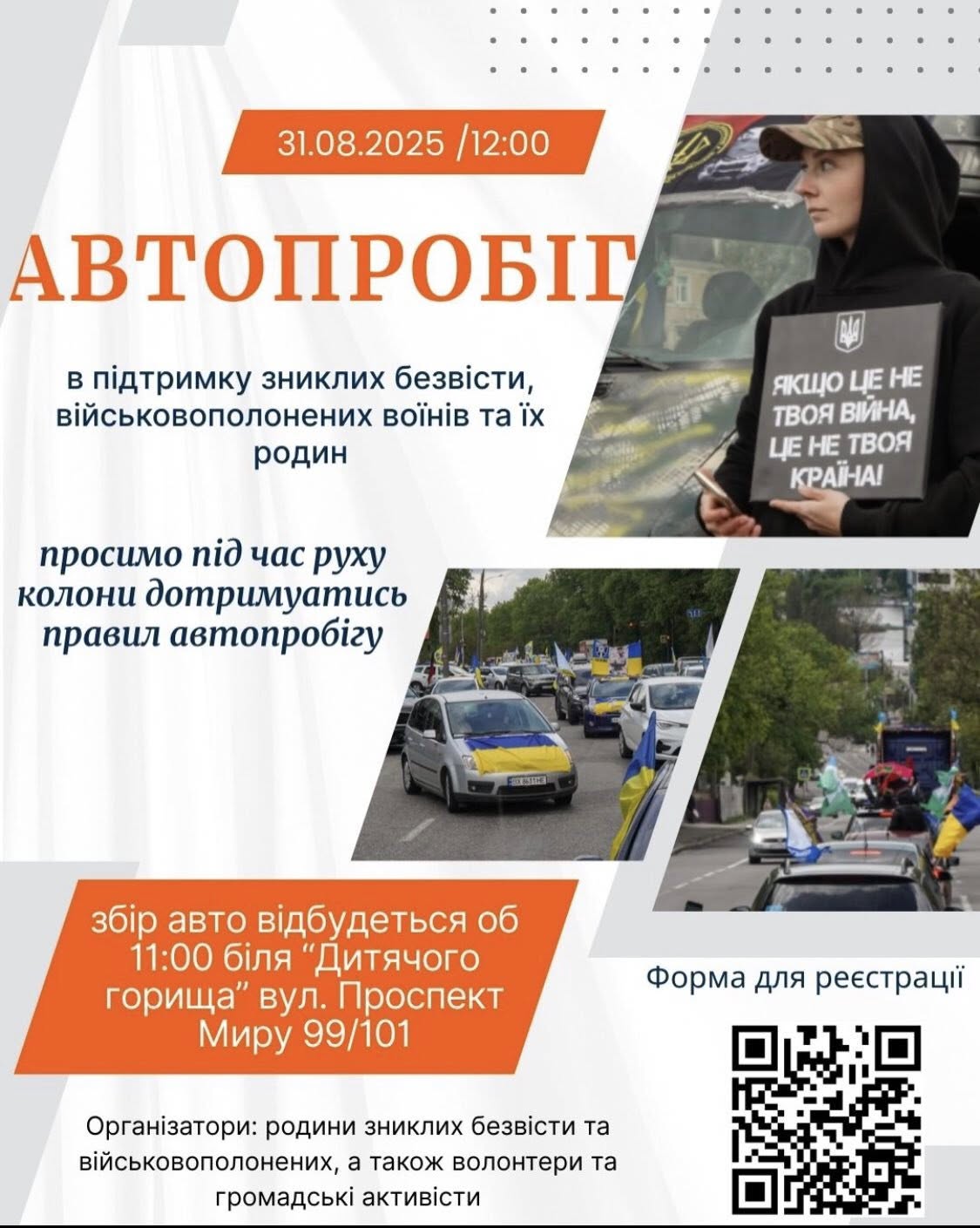 Збір авто та формування колони відбудеться о 11:00 біля «Дитячого горища» (вул. Проспект Миру, 99/101, район Темп).