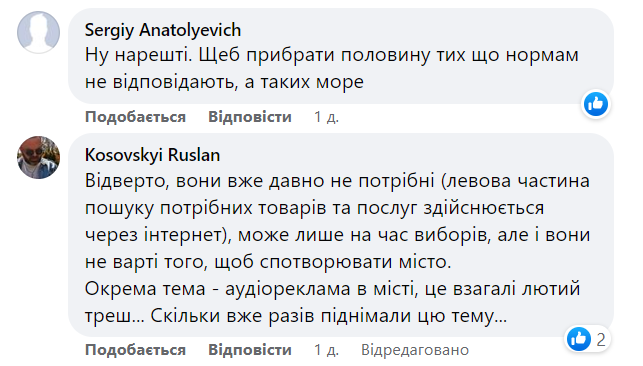 Хмельничани у коментарях підтримують рішення позбутися бордів. І водночас нагадують, що разом з тим слід прибрати аудіорекламу:
