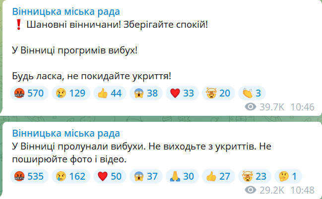 О 10.46 Вінницька міська рада підтвердила, що в місті пролунали вибухи. Куди влучило не повідомляють.