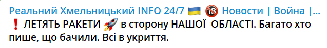 На Хмельниччині ситуація наразі залишається спокійною. Голова Хмельницької ОВА Сергій Гамалій закликав мешканців області бути обережними та залишатися в укриттях.