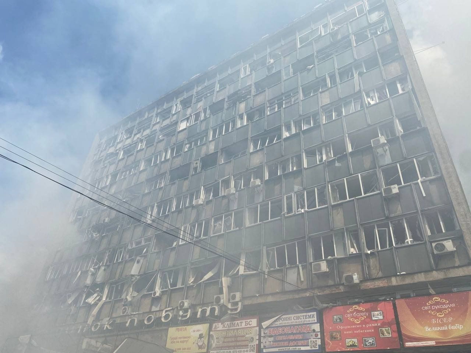 "В 10:50 сталося влучання на паркувальний майданчик поблизу дев’ятиповерхового Будинку побуту «Ювілейний». Попередньо - 8 осіб загинуло та 8 травмовано. Згоріло 25 автомобілів. Працюють 90 рятувальників", - повідомляють в ДСНС України.