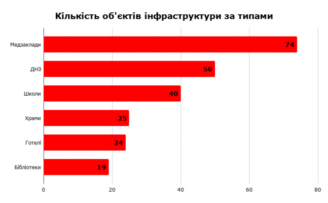 Для аналізу ми обрали шість типів об’єктів — школи, дитсадки, медичні заклади, бібліотеки, готелі та храми. При цьому враховували всі типи власності. Інформацію про розташування об’єктів брали з Карт Google, сайтів місцевих органів влади, сервісів бронювань. Для перегляду шарів даних на карті скористайтеся кнопкою, що розташована ліворуч внизу.