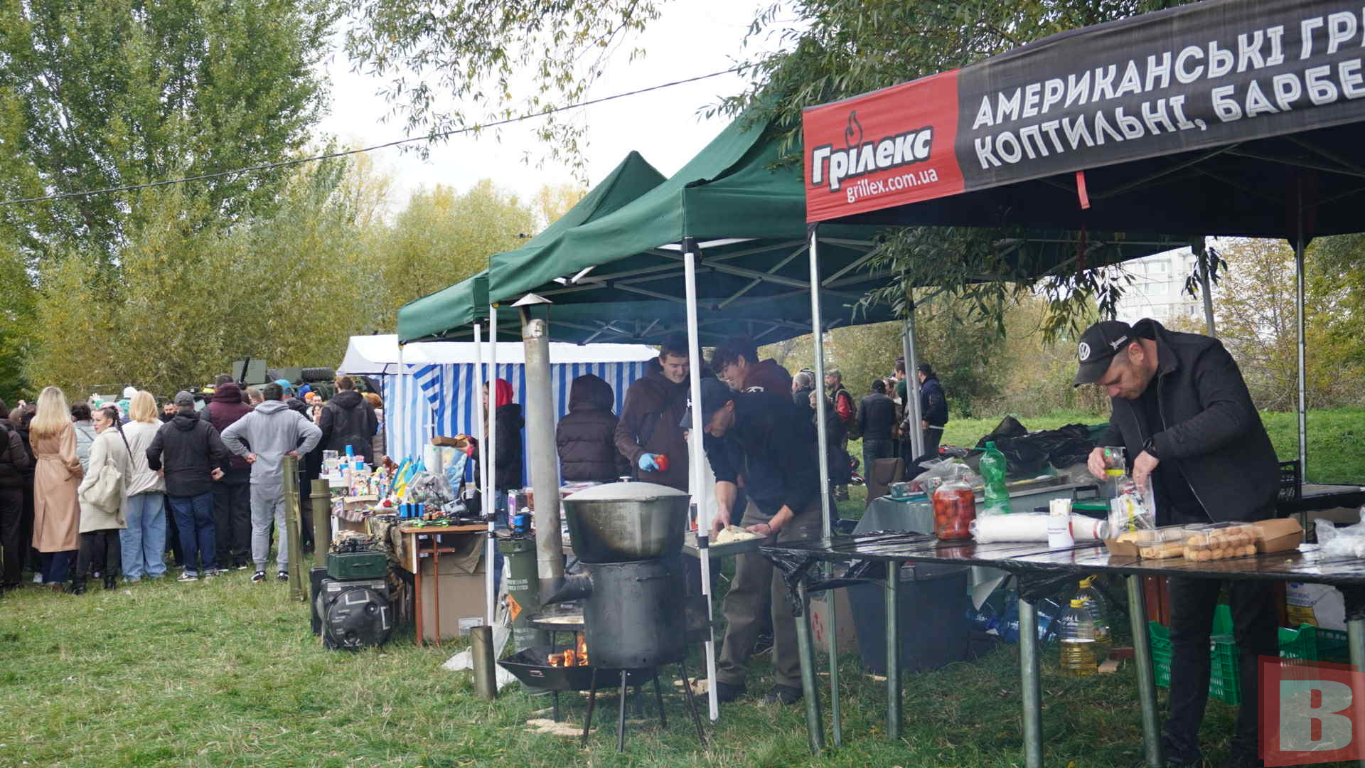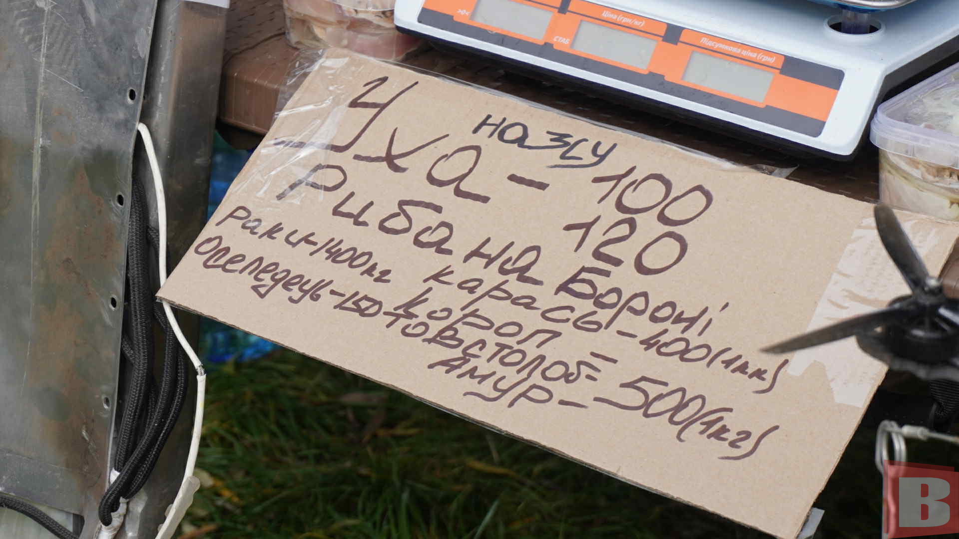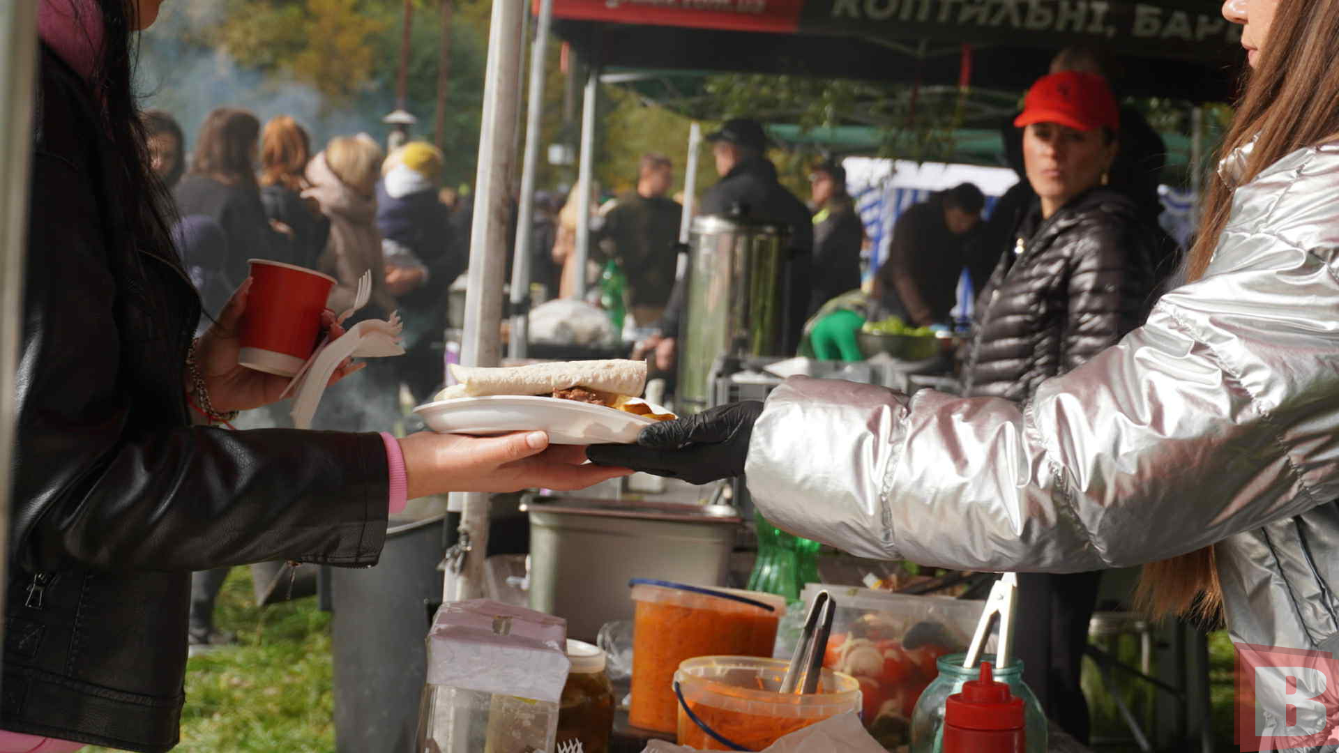 У перервах всі відправляються до фудкорту. Там можна придбати плов, шашлик, бургери. Також продають раки за 1400 гривень/кілограм. Уху за 100 гривень. Товстолоб та амур за 500 гривень/кілограм. Готують все це перед покупцями, на бороні. Ну а тим, хто мерзне, в похмурий осінній день – пропонують глінтвейн.