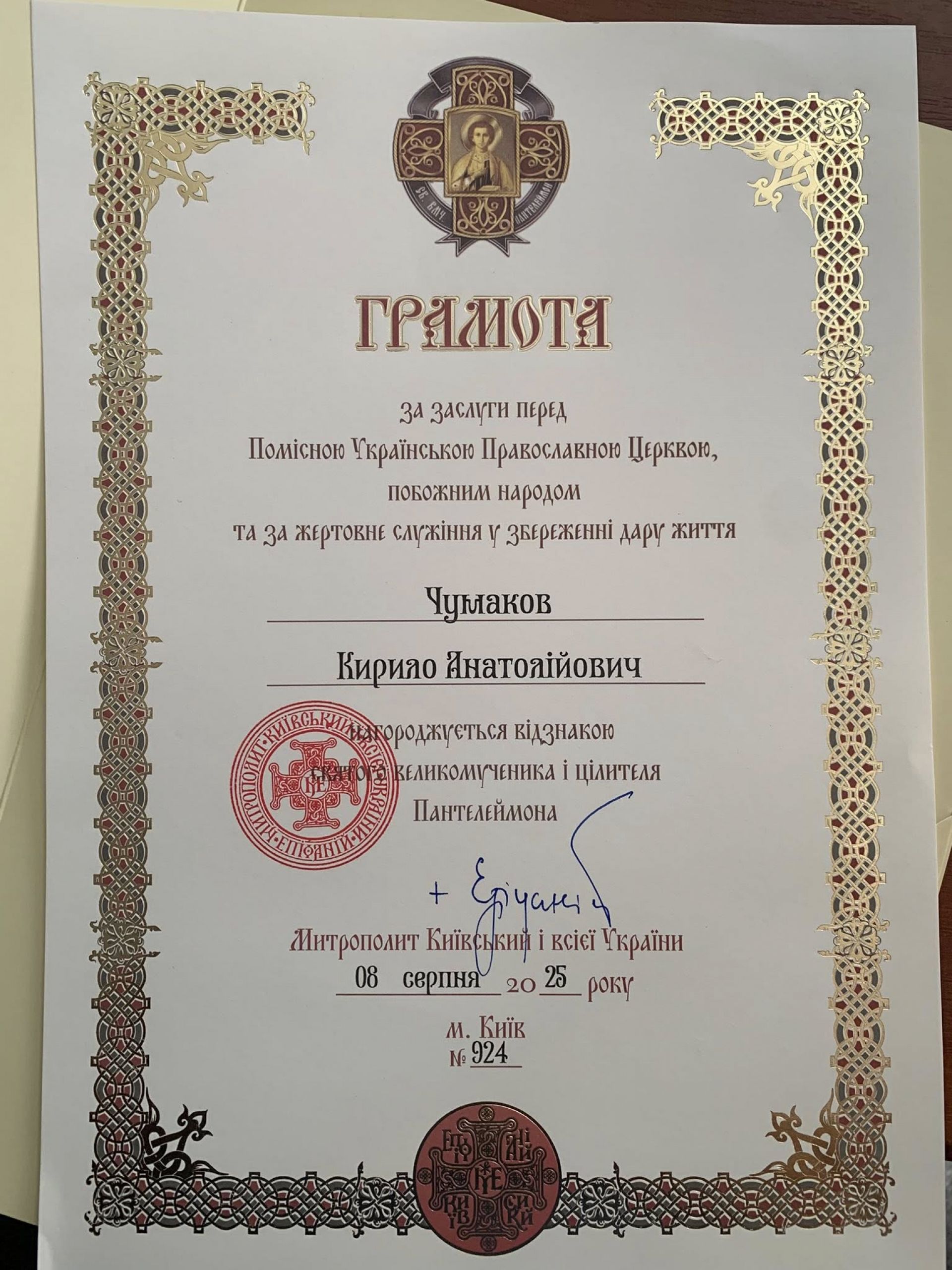Кирило Чумаков отримав найвищу нагороду у сфері охорони здоров’я — відзнаку святого великомученика і цілителя Пантелеймона.