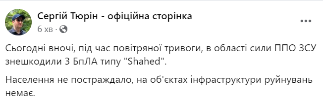 В обласній адміністрації повідомили, що під час атаки в області збили 3 "шахеди". Населення не постраждало, на об'єктах інфраструктури руйнувань немає, зазначив перший заступник начальника ОВА Сергій Тюрін.