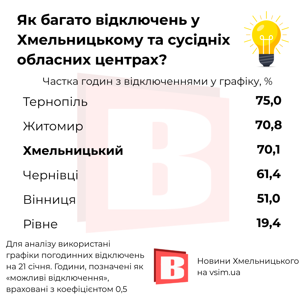 Згідно з отриманими даними, найбільше відключень станом на 21 січня має Тернопіль. У його графіку під відключення виділені близько 75% часу. Менше мають Житомир та Хмельницький — близько 71% та близько 70% відповідно. У Чернівцях та Вінниці під відключення виділені приблизно 61% та 51% часу відповідно. Найменше часу з відключеннями у Рівному — близько 19%. Всі дані також дивіться в інфографіці. Посилання на джерела даних: Хмельницький, Вінниця, Житомир, Рівне, Тернопіль, Чернівці.