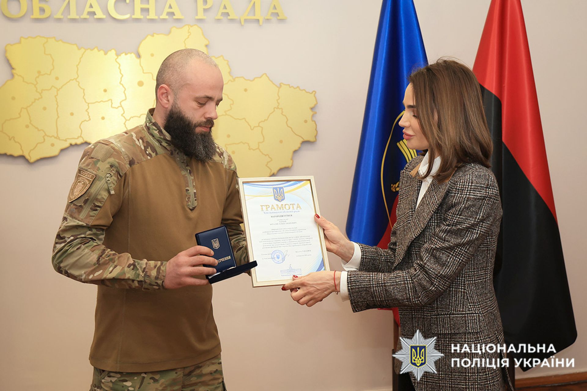 Так, Грамотою обласної ради та нагрудним знаком «За відданість державі» Віолета Лабазюк нагородила бійця поліцейської спецроти «Богдан» Віталія Качана.