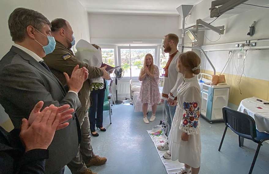 У військовому госпіталі “Персі” 6 червня одружився поранений український військовий Сергій Никуляк та його наречена Марія Храбрих. Обоє молодят з Хмельниччини. Марія з Нетішина, а Сергій зі Старої Ушиці.