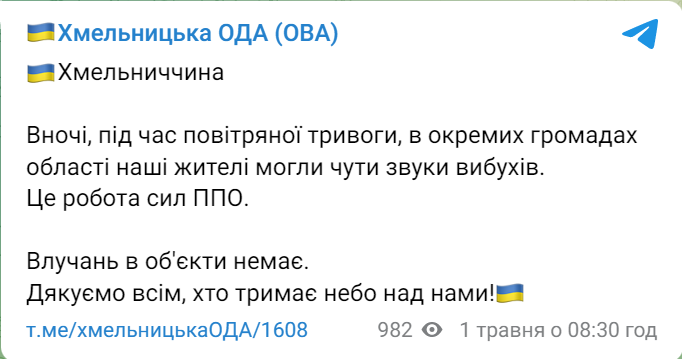 В Хмельницькій області влучань немає, а звуки вибухів, які могли чути мешканці — робота ППО.