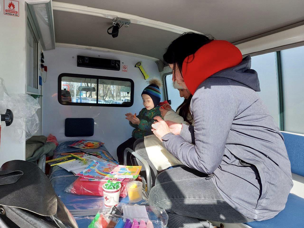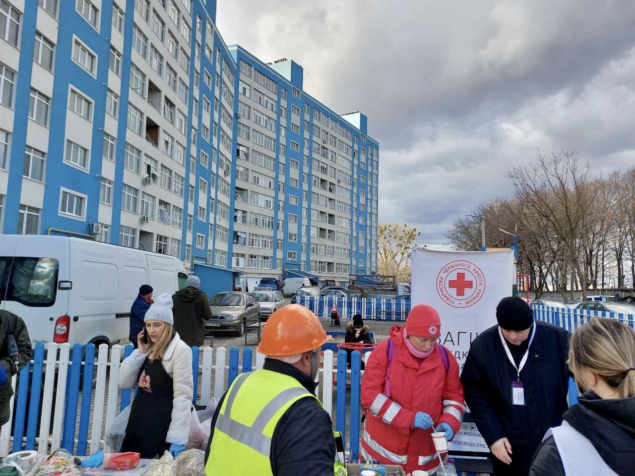 Біля будинку, який найбільше постраждав, волонтери Червоного Хреста розгорнули свій пункт допомоги. Дітям надавали психосоціальну підтримку, а постраждалим з уламковими пораненнями – першу допомогу. Також організували перекуси і гарячий чай.