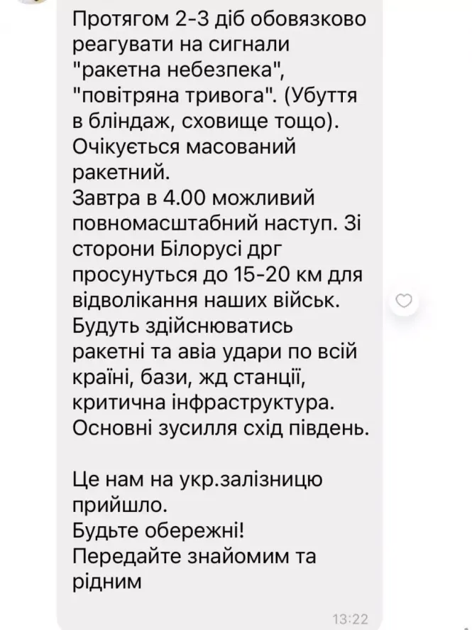 У повідомленні йшлося, що протягом кількох днів потрібно обов’язково реагувати на сигнали повітряної тривоги та спускатися в укриття. Мовляв, у цей період існує велика загроза ракетних ударів. Також зазначалось, що о 4:00 (проте невідомо, якого саме дня) можливий повномасштабний наступ, а диверсійно-розвідувальні групи просунуться на 15-20 кілометрів вглиб території України для відволікання військ. А в кінці повідомлення примітка - “це нам на укр. залізницю прийшло”. До слова, подібна за змістом інформація “гуляла” на багатьох сайтах і у соцмережах.