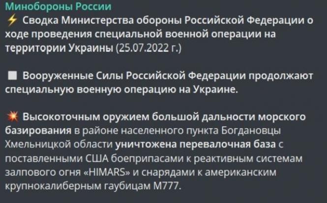 - Високоточною зброєю великої дальності морського базування в районі населеного пункту Богданівці Хмельницької області знищено перевалочну базу з поставленими США боєприпасами до реактивних систем залпового вогню «HIMARS» та снарядами до американських великокаліберних гаубиць М777», - повідомили агресори.