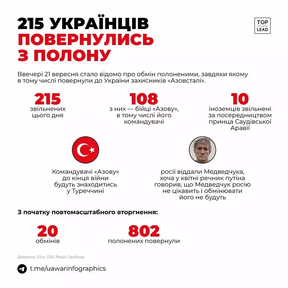 Нагадаємо, тільки у вересні з російського полону повернулося 235 українців. Зокрема, 21 вересня вдалося звільнити 215 захисників та захисниць. Серед звільнених – 9 мешканців Хмельниччини.
