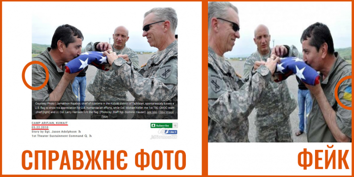 Варто також зазначити, що фото перед публікацією можуть віддзеркалювати з метою уникнення виявлення фальсифікації. Приклад — знімок, де ніби український військовий цілує американський прапор. Втім, насправді український прапор на плечі чоловіка домалювали, а фото віддзеркалили. Якщо у вас є сумніви у певному фото, ви можете відзеркалити його з допомогою фоторедактора та перевірити у пошуку, як описано вище.