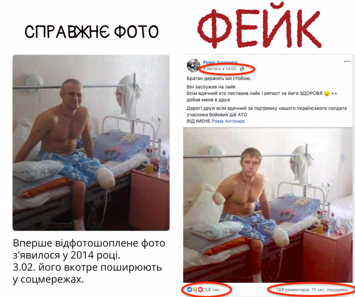 Так, у Facebook поширювалося фото з нібито українським військовим з важкими пораненнями, який перебуває у лікарні. Зображення супроводжувалося емоційним текстом з закликом поставити лайк та зробити репост. Як з’ясувалося, фото було оброблене. Це помітно за неприродним освітленням тіла «військового». Оригінал світлини з’явився у Facebook ще 2014 року. Обидва знімки можна переглянути нижче. Перший з них — фото справжнього військового, друге — фальсифікація. Мало того, фотофейк використовували для збору коштів на допомогу.