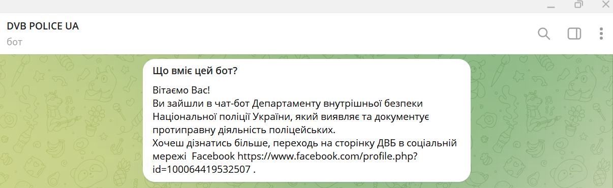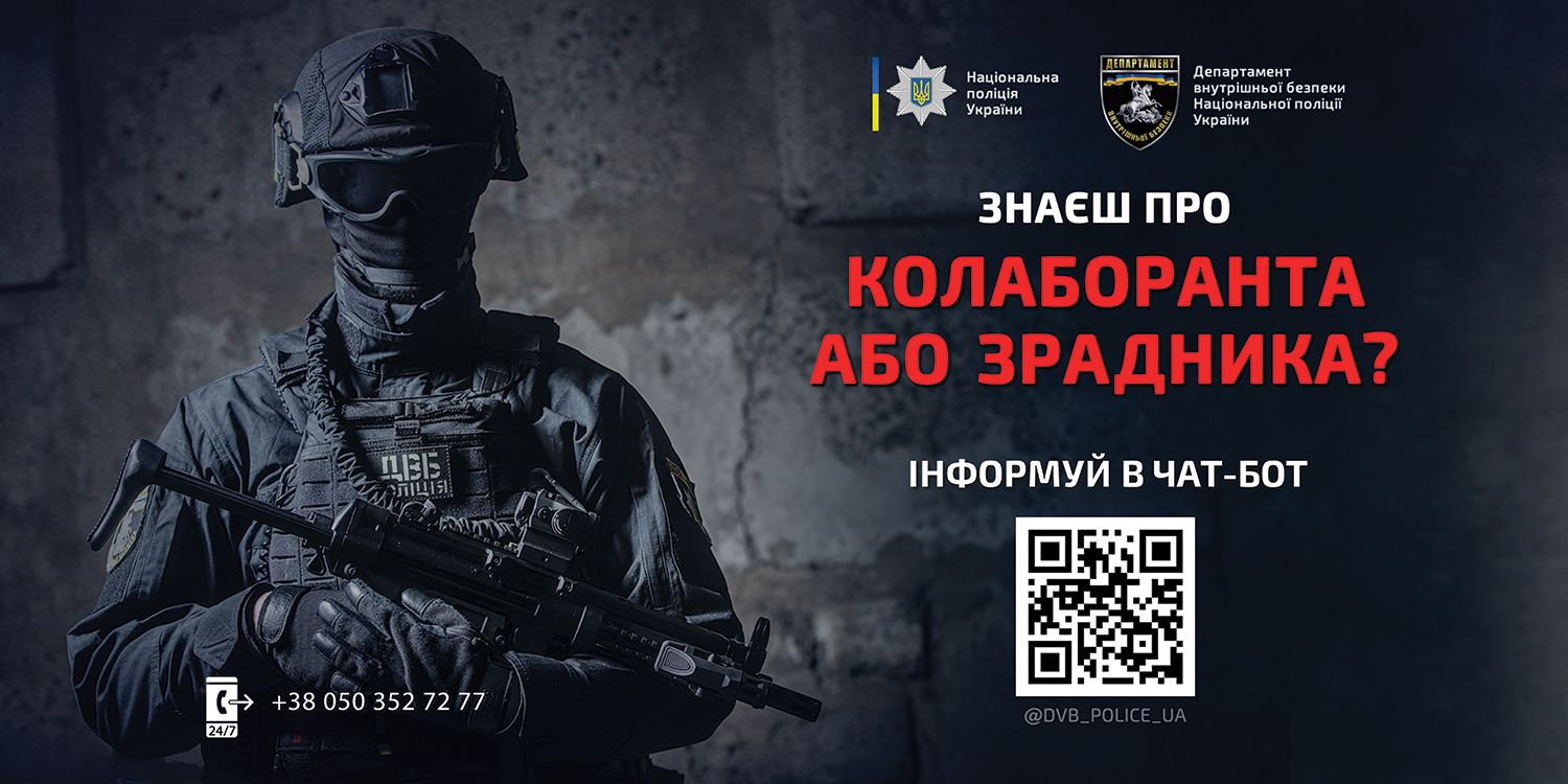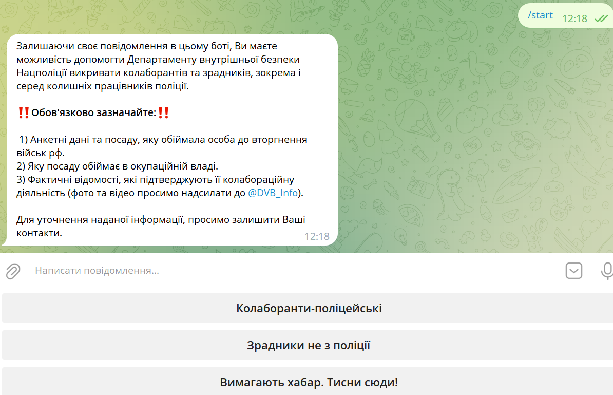 В зв’язку з цим в Департаменті внутрішньої безпеки Нацполіції запустили чат-бот для отримання інформації про зрадників та колаборантів.