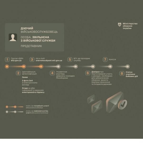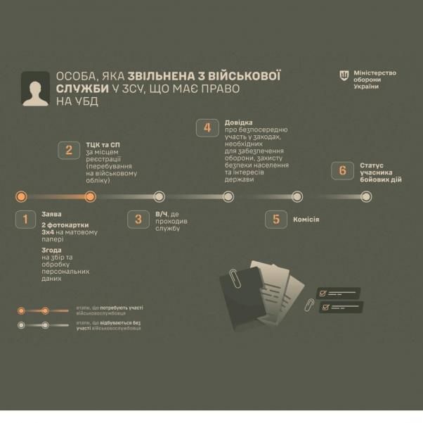 Для пришвидшення розгляду заяви особам, які звільнені з військової служби у Збройних Силах України, рекомендуємо звертатися до ТЦК та СП за місцем реєстрації (перебування на військовому обліку). Разом із заявою потрібно подати згоду на збір та обробку персональних даних, дві кольорові фотокартки розміром 3x4 сантиметри на матовому папері.