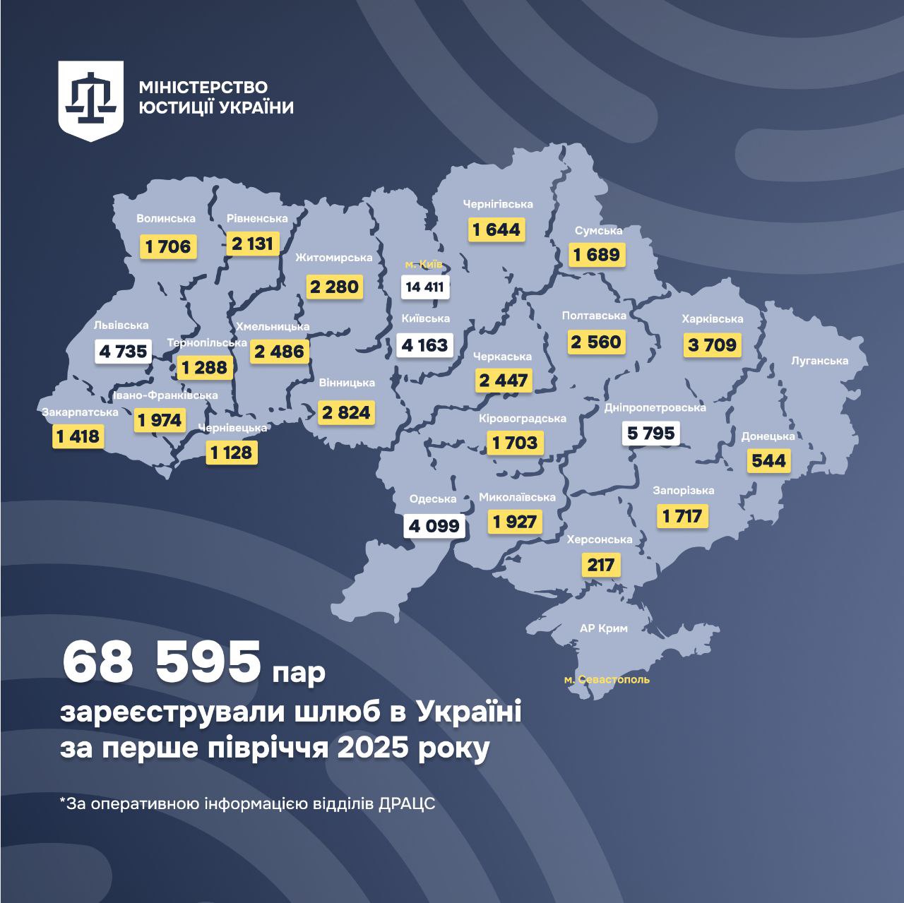 За даними Міністерства юстиції України, за перше півріччя 2025 року в Україні було укладено 68 595 шлюбів. Як зазначили у відомстві, тільки в Києві обмінялись обітницями понад 14 тисяч пар. Також серед лідерів зареєстрованих шлюбів — Дніпропетровська (5 795), Львівська (4 735), Київська (4 163) та Одеська (4 099) області.