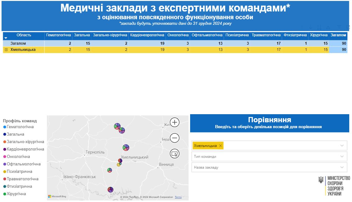 Найбільше експертних команд працюватиме за профілем «кардіоневрологічна». Їх сформовано 19. По дві команди в Дунаєвецькій багатопрофільній лікарні та Багатопрофільній центральній районній лікарні. Ще по три в медзакладах у Хмельницькому, Славуті, Шепетівці та Старокостянтинові. Найменше – у фтизіатричній. Всього одна команда, яка проводитиме оцінювання у КНП «Хмельницький обласний фтизіопульмонологічний медичний заклад»”.