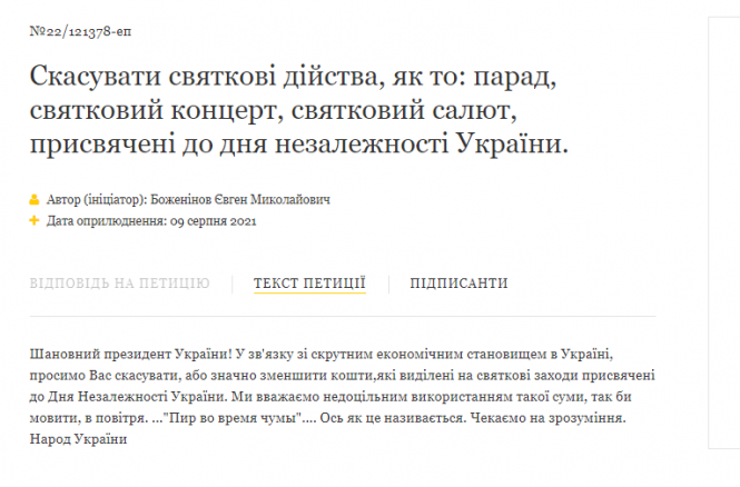 «Скасувати святкові дійства, як то: парад, святковий концерт, святковий салют, присвячені до Дня Незалежності України», - таку пропозицію зареєстрували на сайті електронних петицій вчора, 9 серпня. Її автор Євген Боженінов вважає, що всі святкові дійства слід скасувати у зв’язку зі «скрутним економічним становищем в Україні» або «зменшити кошти, виділені на святкові заходи».