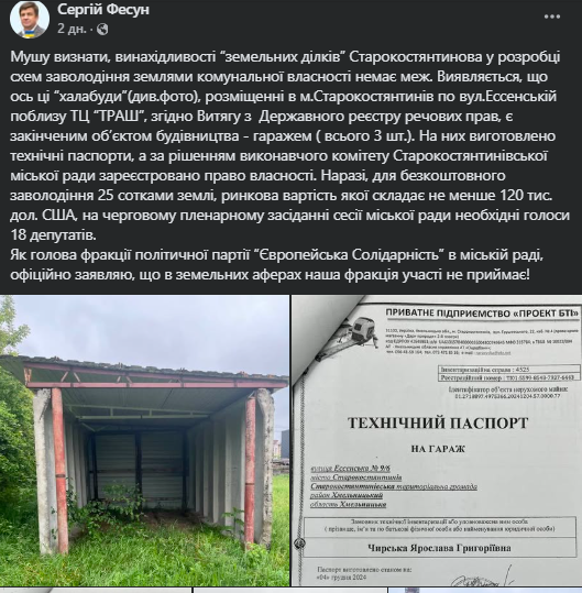 На своїй сторінці у соціальних мережах депутат Старокостянтинівської міської ради Сергій Фесун розповів про можливу схему заволодіння землями комунальної власності. Обранець показав так звані «халабуди», які, згідно із документами, є гаражами й завершеними об’єктами будівництва. Стоять вони на земельній ділянці, яку у 2022-му передали в оренду громадянці. Так у чому ж тут можлива махінація – розповідаємо.